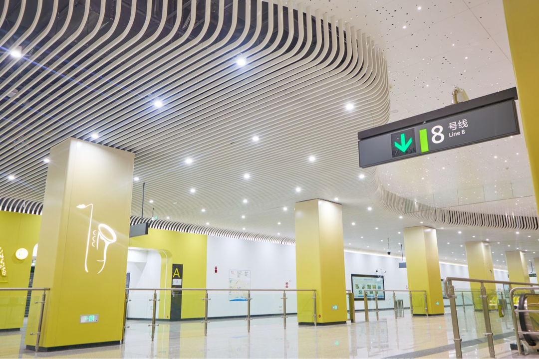 走进8号线二期工程圣灯公园站,车站穹顶LED灯带精心设计、排列,流动的线条宛如电吉他灵动的琴弦;龙潭寺站如手风琴般的立柱设计,仿佛下一秒就会奏响城市生活的乐章;灵感来源架子鼓元素的同乐站,让人们时刻感受城市的脉动与活力;车站出入口,巧妙将说唱俑形象与现代交通完美交汇,建筑立面融入丰富的音乐元素,无不展示着音乐的律动……