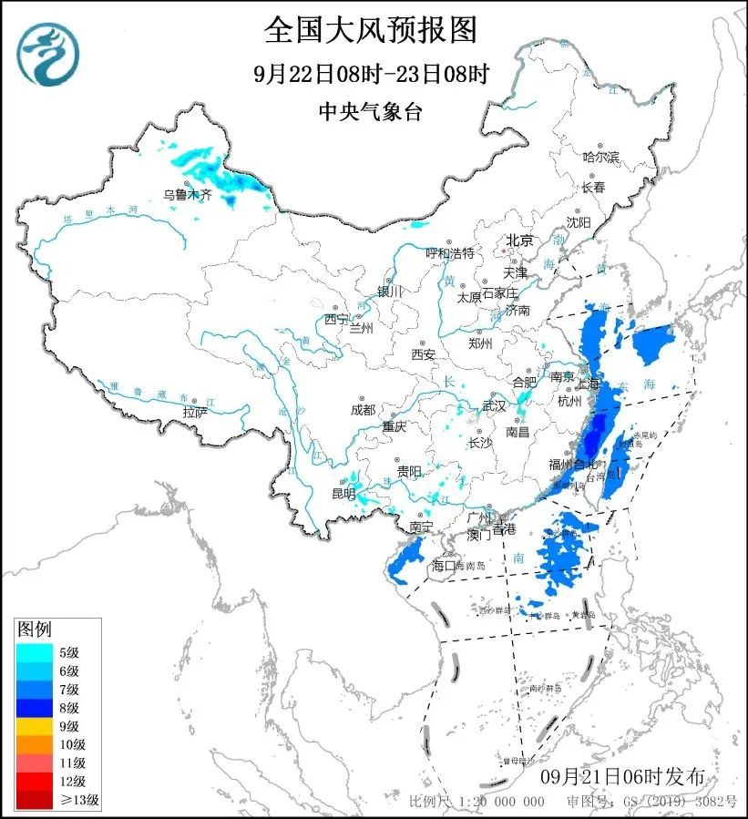 9月22日08时至23日08时,新疆北疆东部和沿天山地区、上海东部、云南东南部、台湾岛等地将有5~6级、阵风7级的大风。黄海南部海域、东海大部海域、台湾海峡、台湾以东洋面、南海东北部和中东部海域、北部湾将有7~8级、阵风9~10级的大风。