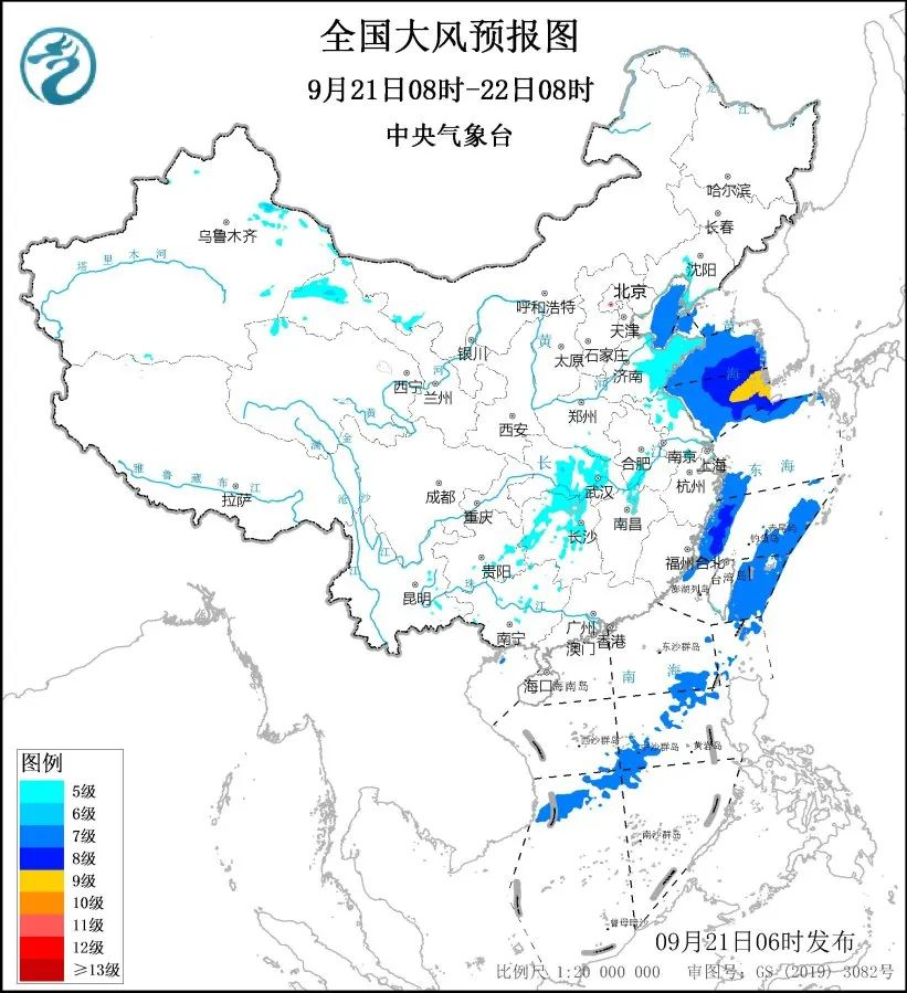 预计,9月21日08时至22日08时,辽宁南部、甘肃河西、山东中东部和南部、安徽中部、江苏北部、上海东部、湖北北部和东部、湖南中西部和北部、江西北部、台湾岛等地将有5~6级、阵风7~8级的大风。渤海、渤海海峡、黄海大部海域、东海大部海域、台湾海峡、台湾以东洋面、南海东北部和中东部海域、南海西南部海域将有7~8级、阵风9级的大风,其中黄海东南部部分海域风力可达9级、阵风10~11级。
