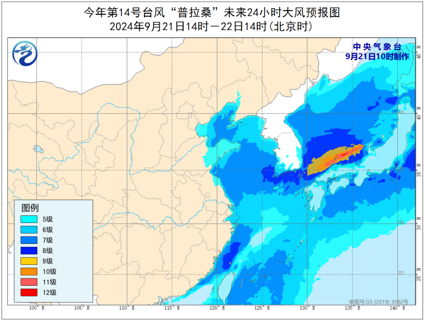 大风预报:9月21日14时至22日14时,受“普拉桑”和冷空气的共同影响,渤海、渤海海峡、黄海、东海大部、台湾海峡、辽东半岛沿海、河北沿海、天津沿海、山东半岛沿海、江苏沿海、长江口区、杭州湾、上海沿海、浙江沿海、福建沿海、广东东部沿海将有6-7级大风,阵风8-9级,其中黄海东南部、东海西部的部分海域风力有8级,阵风9-10级。