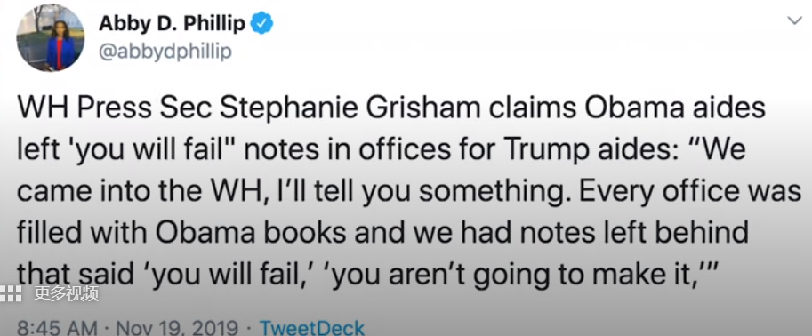 当地时间11月19日,美国白宫新闻主任格里沙姆称,奥巴马当政时期的白宫官员给即将上任的特朗普政府的继任者们留下过嘲讽性的便条,便条写着诸如“你们会失败的”等诅咒性语言。