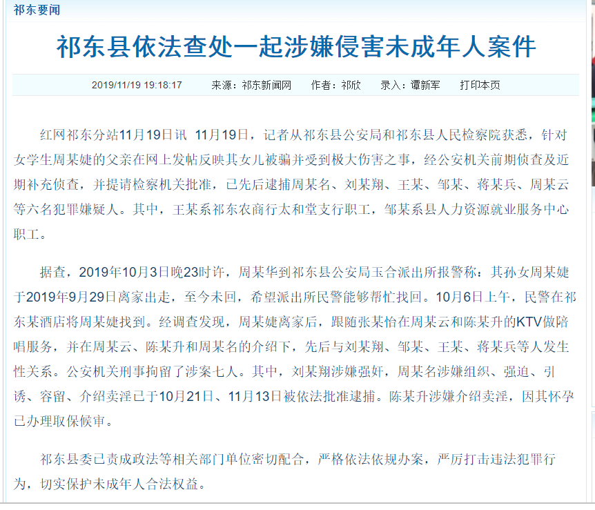 11月20日,封面新闻从湖南祁东县委主办的“祁东新闻网”获悉,针对女学生周某婕父亲发帖反映女儿被骗并受到伤害之事,经公安机关前期侦查及近期补充侦查,并提请检察机关批准,已先后逮捕六名犯罪嫌疑人。其中,王某系祁东农商行太和堂支行职工,邹某系县人力资源就业服务中心职工。