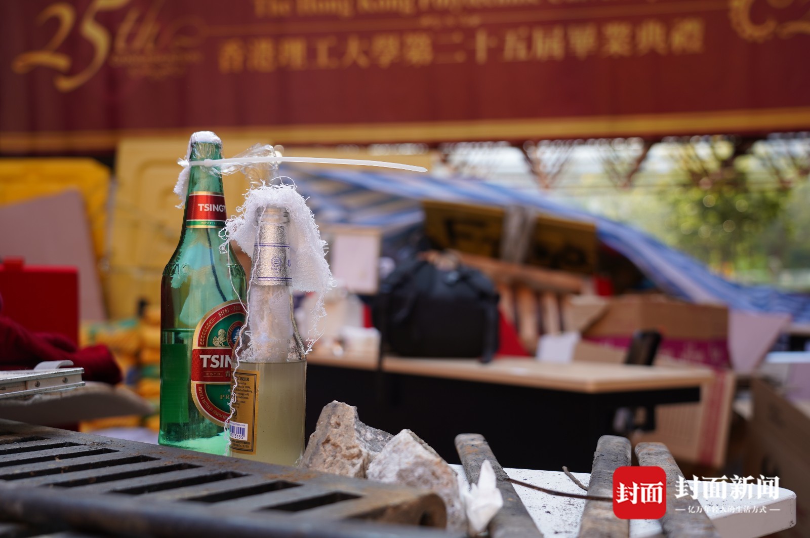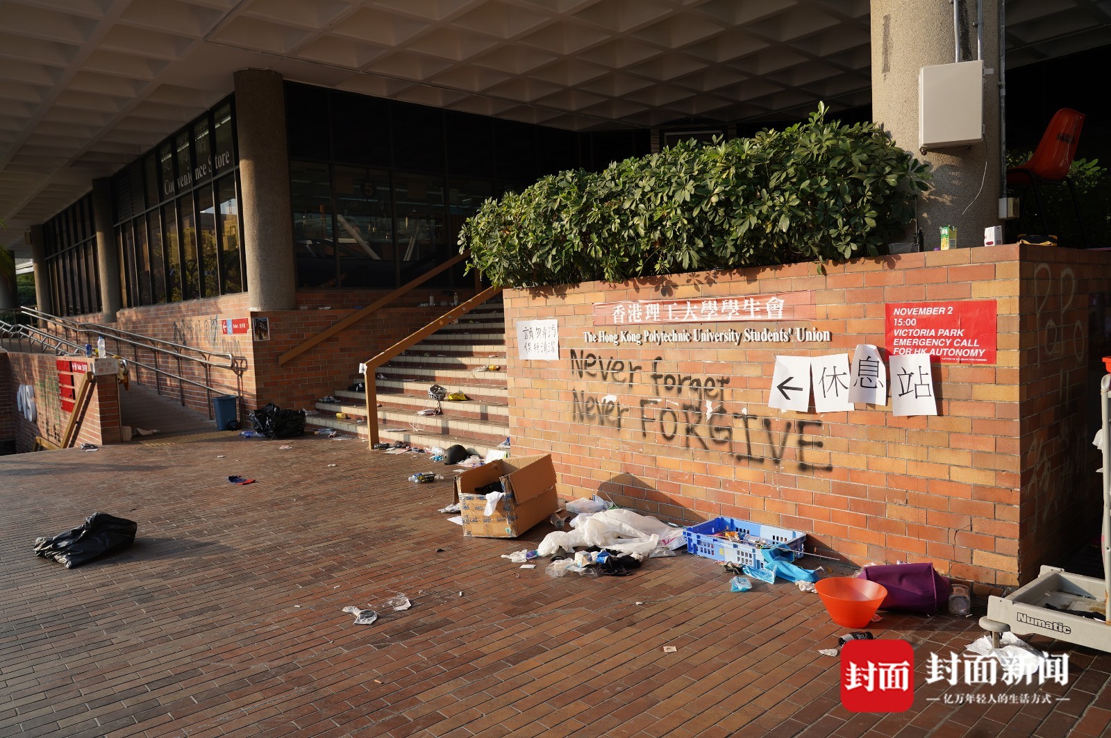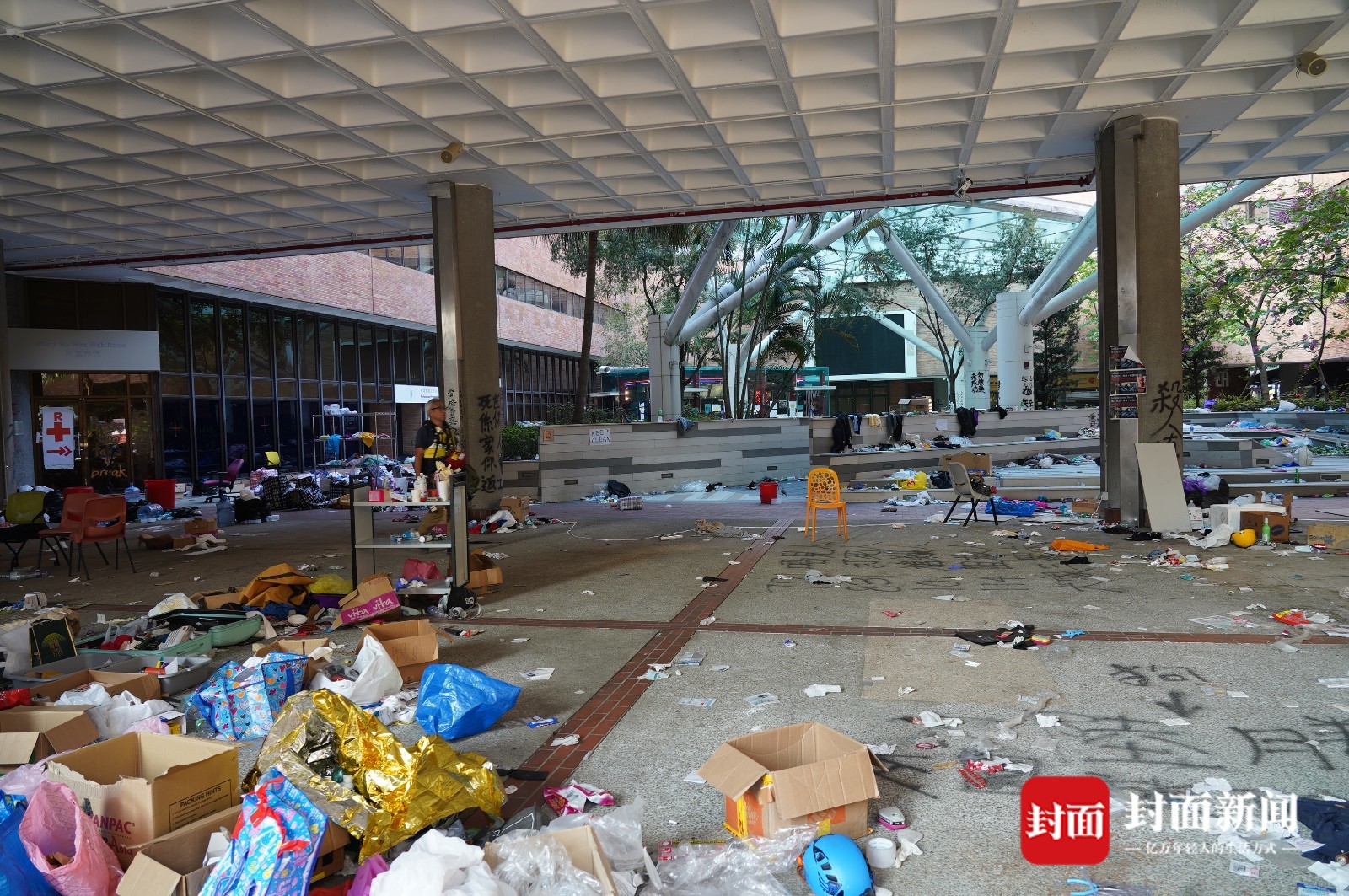 靠近校门的位置有大量自制汽油弹,桌上地上,有的散乱放着,有的成堆在纸箱里。校园北部的角落是另一个汽油弹聚集地,这里看上去更像是工厂,除了大量制成品,还有不少桶装原料,散发着难闻气味。生活垃圾则几乎无处不在,校内的超市遭到洗劫,许多店铺被打砸或焚烧,一些大楼底层的落地玻璃被完全敲碎,道路上布满碎砖……很难用一个或几个形容词来精确描述这里的混乱,有点类似洪水肆虐后的景象,但每一寸地方显然都不是天灾而是人祸的结果。