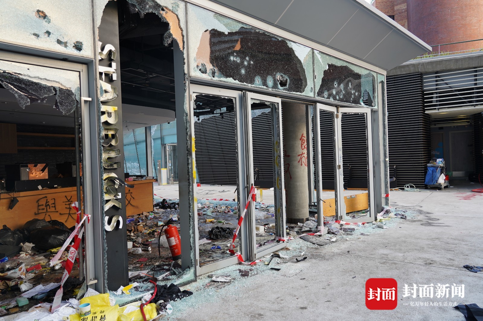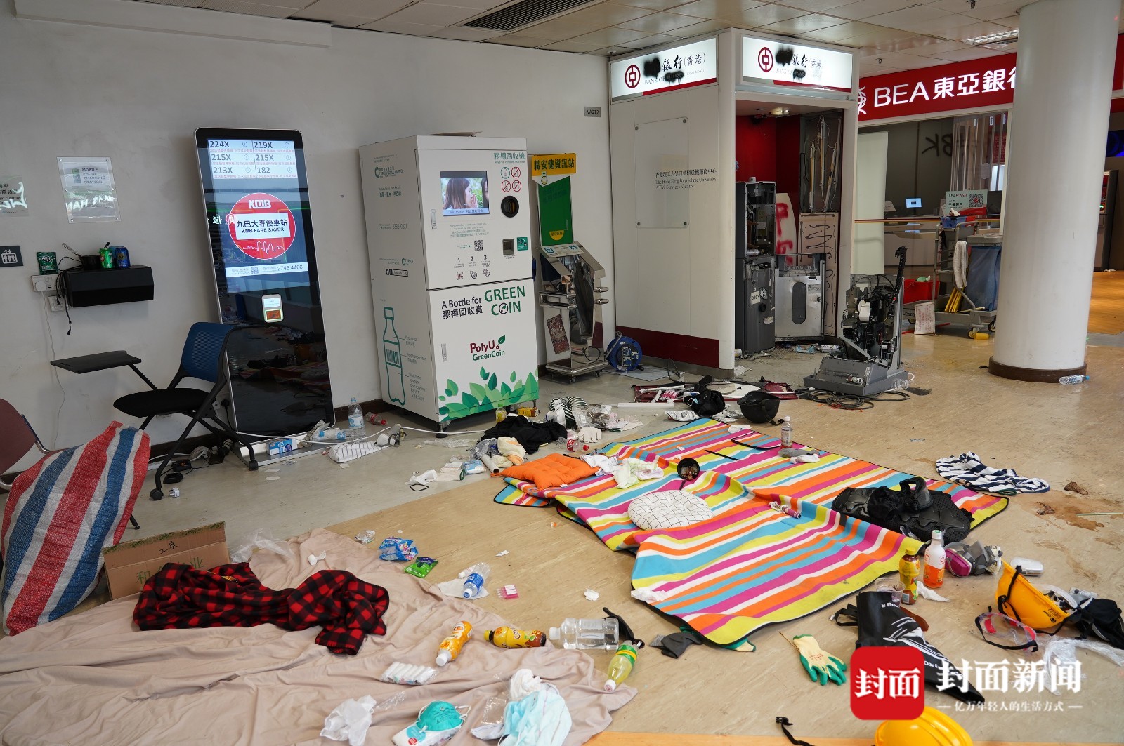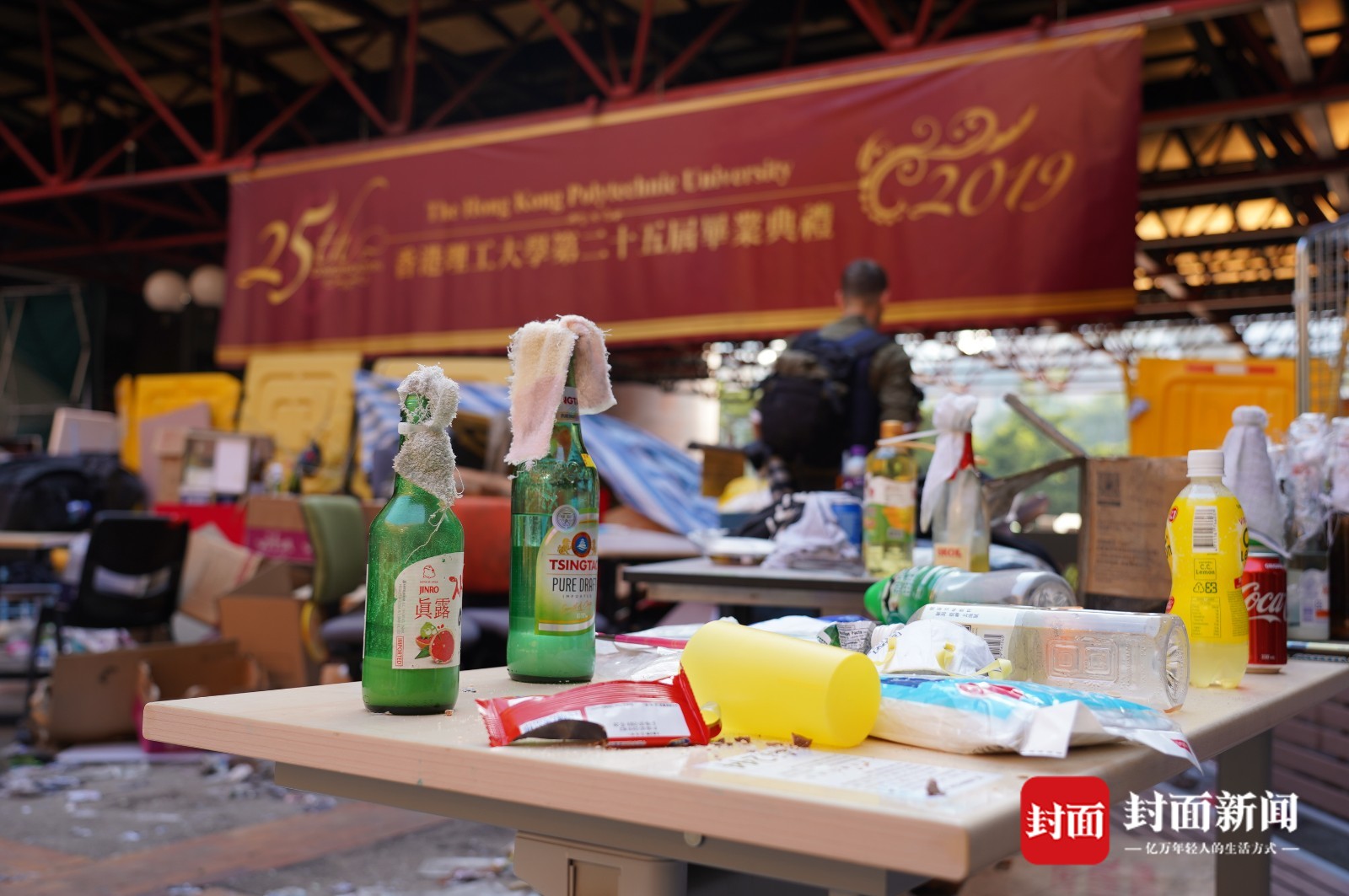 靠近校门的位置有大量自制汽油弹,桌上地上,有的散乱放着,有的成堆在纸箱里。校园北部的角落是另一个汽油弹聚集地,这里看上去更像是工厂,除了大量制成品,还有不少桶装原料,散发着难闻气味。生活垃圾则几乎无处不在,校内的超市遭到洗劫,许多店铺被打砸或焚烧,一些大楼底层的落地玻璃被完全敲碎,道路上布满碎砖……很难用一个或几个形容词来精确描述这里的混乱,有点类似洪水肆虐后的景象,但每一寸地方显然都不是天灾而是人祸的结果。