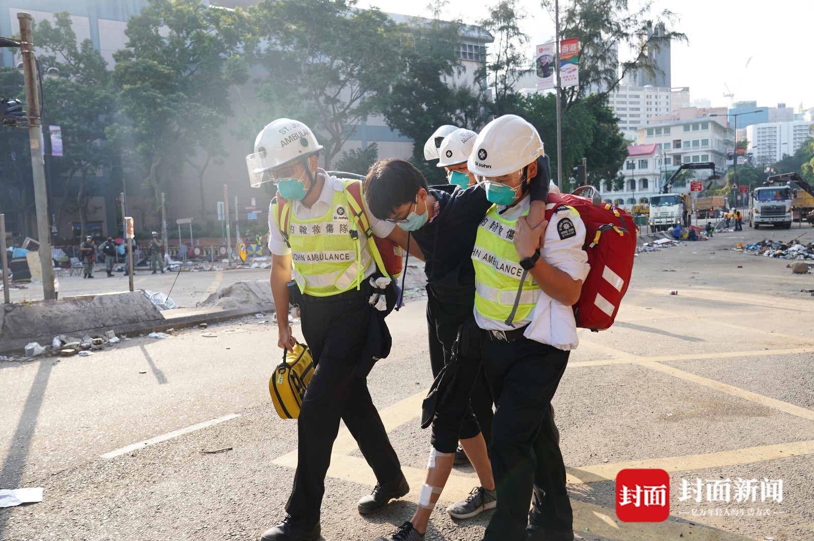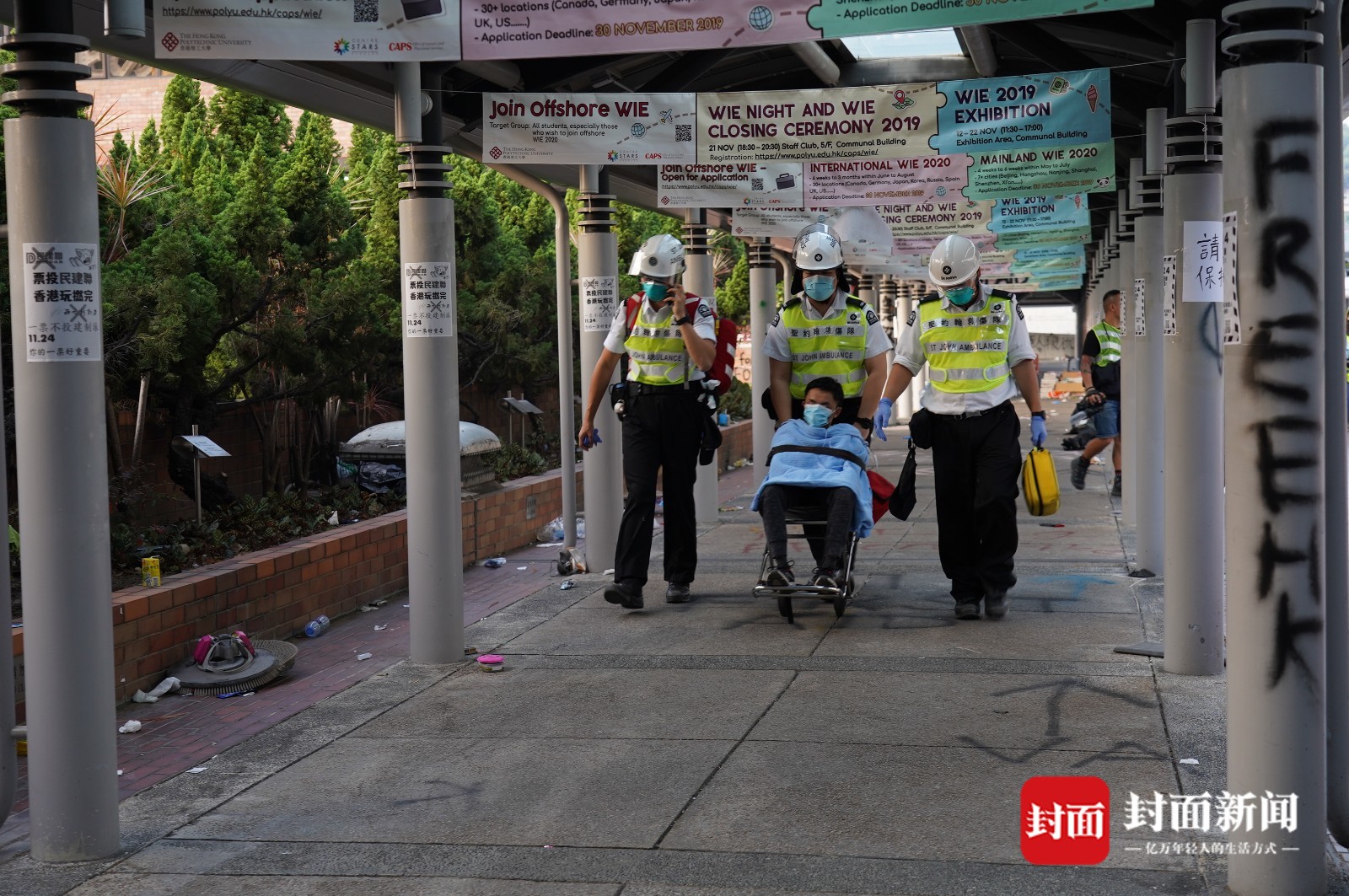 记者在理大校园里逗留了约1个小时。刚进校时,正碰见一个决定自首的年轻人,被两位急救队员搀扶着,一瘸一拐地走出校门。而当记者准备离开时,又看到一个。他是用轮椅推出去的,身上盖着毯子,头无力地向后仰着,几乎睁不开眼睛。而在几天前,他们还生龙活虎地冲着警察叫嚣,掷出一团又一团火焰。