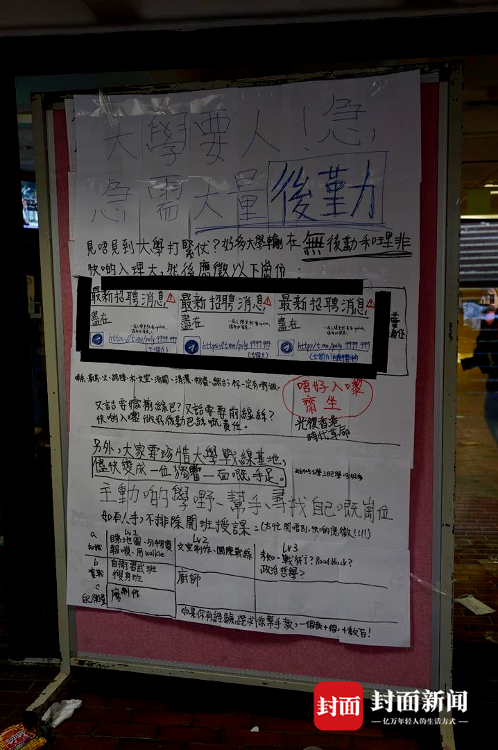 可以看到,他们中有的人似乎在尝试进行管理。许多墙壁上写着中英文的“保持清洁”。在一张自制的大地图上,标注着校内各个区域的分工,包括急救、社工、物资、饭堂、衣帽间、工具间等。他们甚至还在校园内搞过招聘和培训。一块白板上写着各种岗位需求,例如哨兵、厨房、路障、文宣、清洁,居然还有“海关”。在培训的版块,授课内容包括看地图、分物资、自卫习武、搜身等等。他们似乎还想开设政治哲学课,但明显有些犹豫,课表后面打了个“?”。