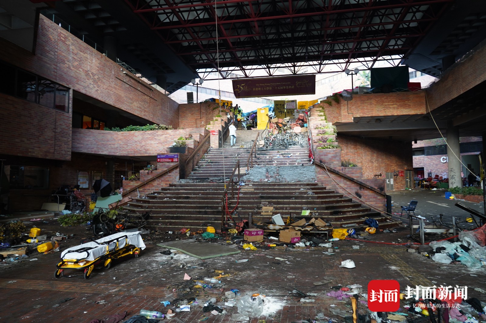 如今,穹顶被熏得黢黑,地上满是废纸、污水和焚烧残余,台阶上一堆堆被烧得扭曲变形、交缠在一起的金属条。在台阶顶上,用课桌椅等杂物垒成一道墙,挡住进入校园的通道。