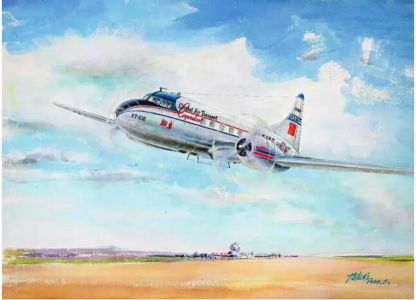 1950年8月1日,“北京”号康维尔CV-240飞机胜利完成中国民航首航任务,史称“八一开航”。该机曾是参加“两航起义”的飞机。 (陈应明画作,图据航空知识)