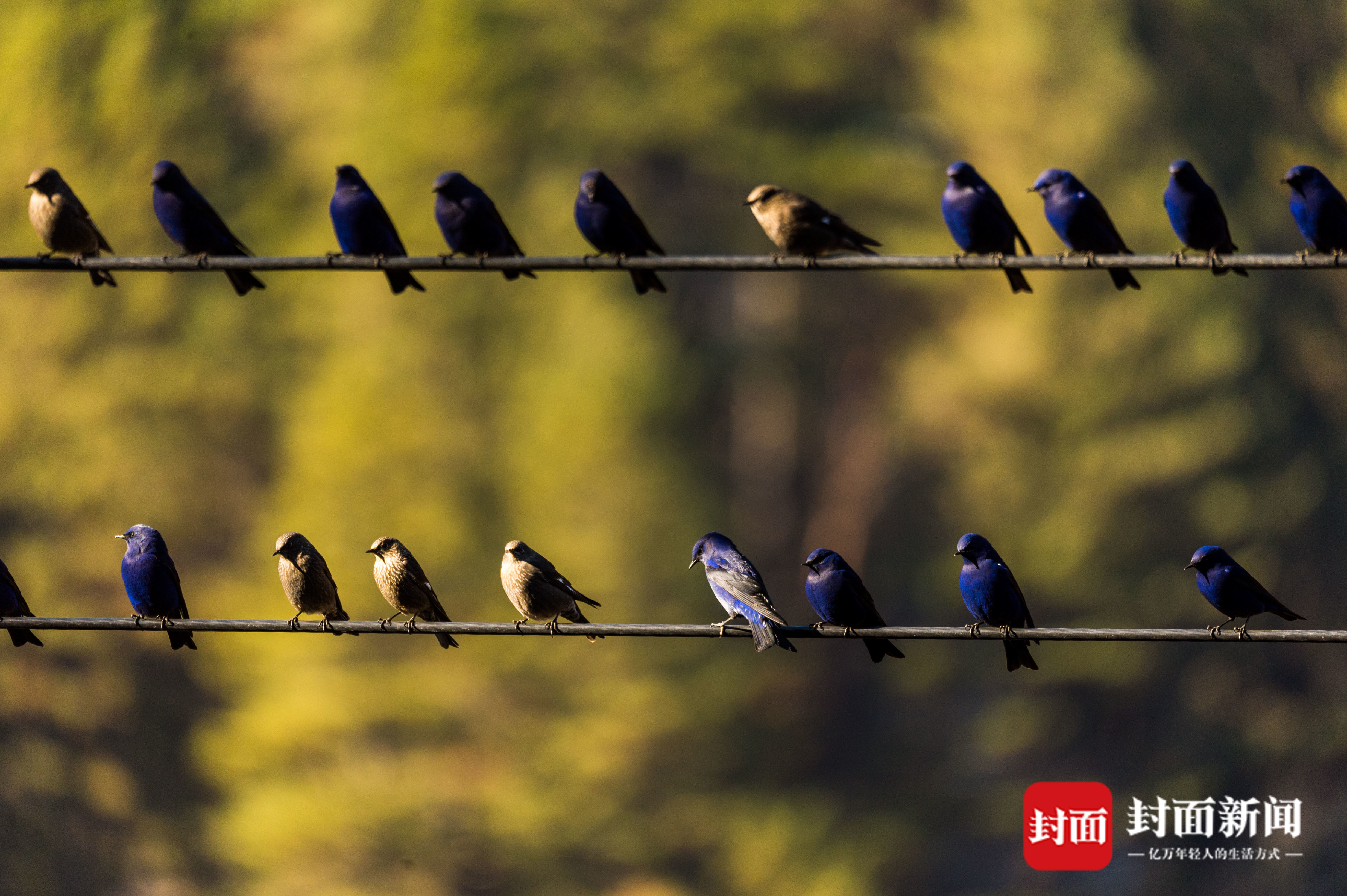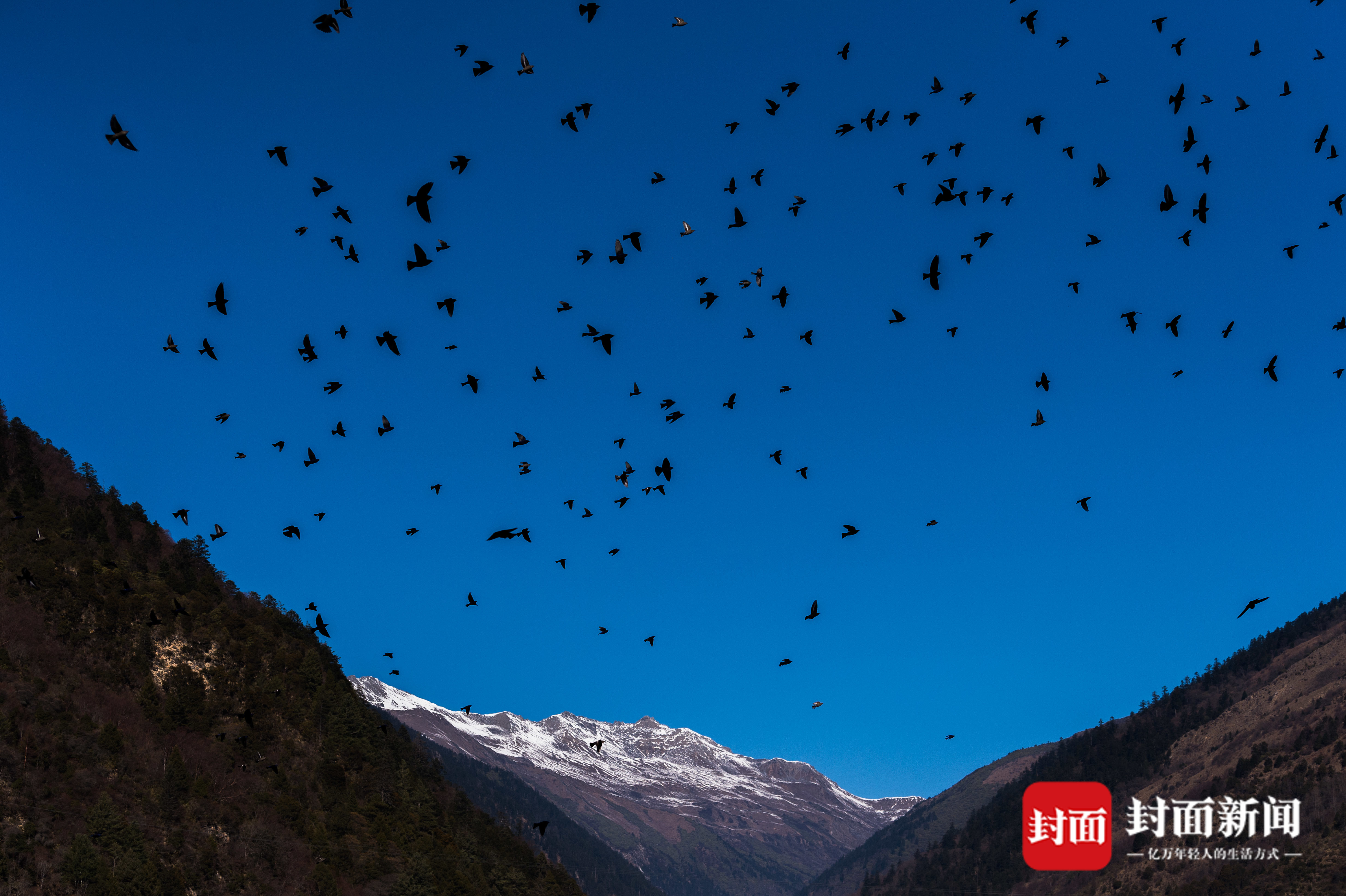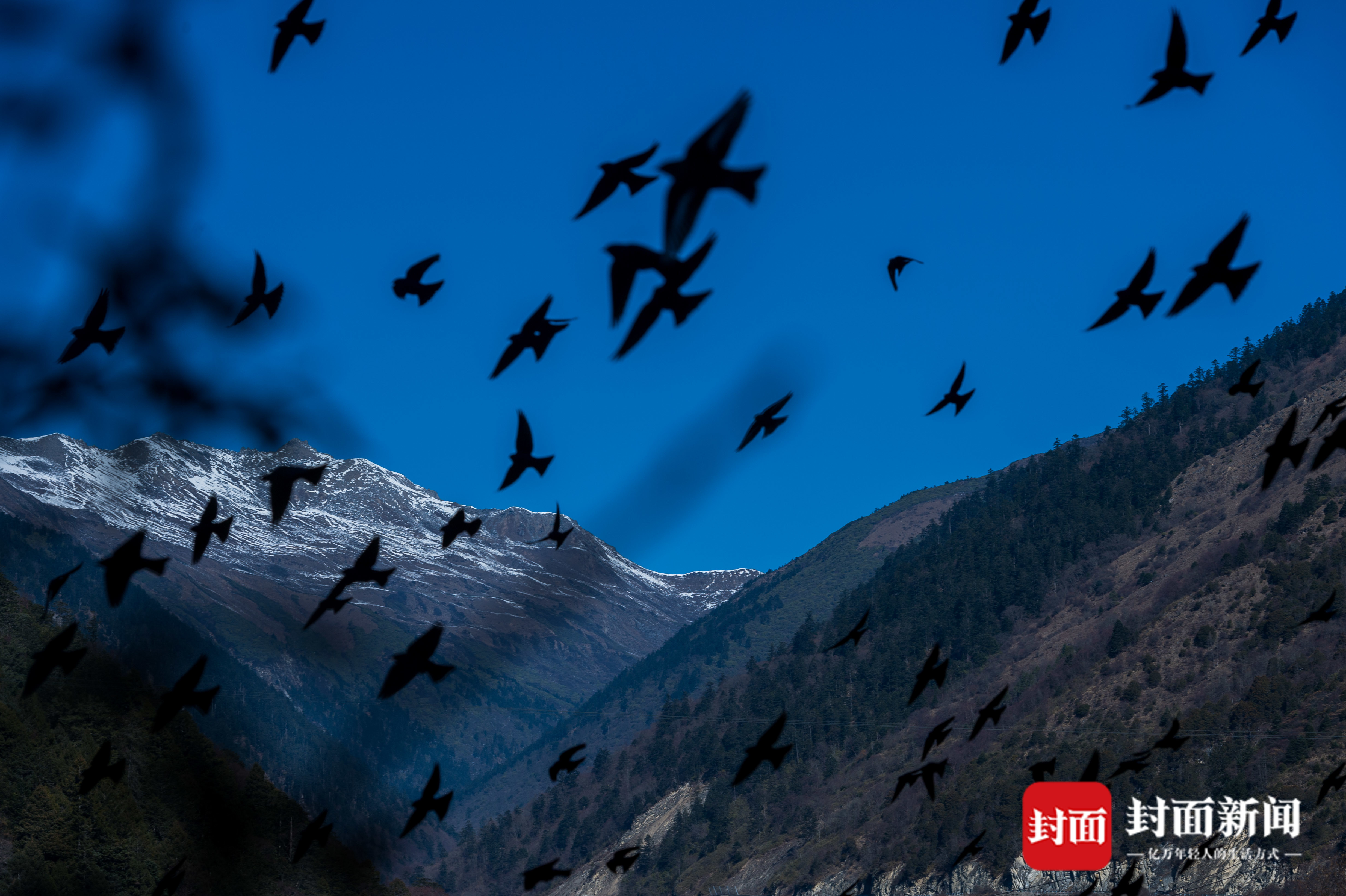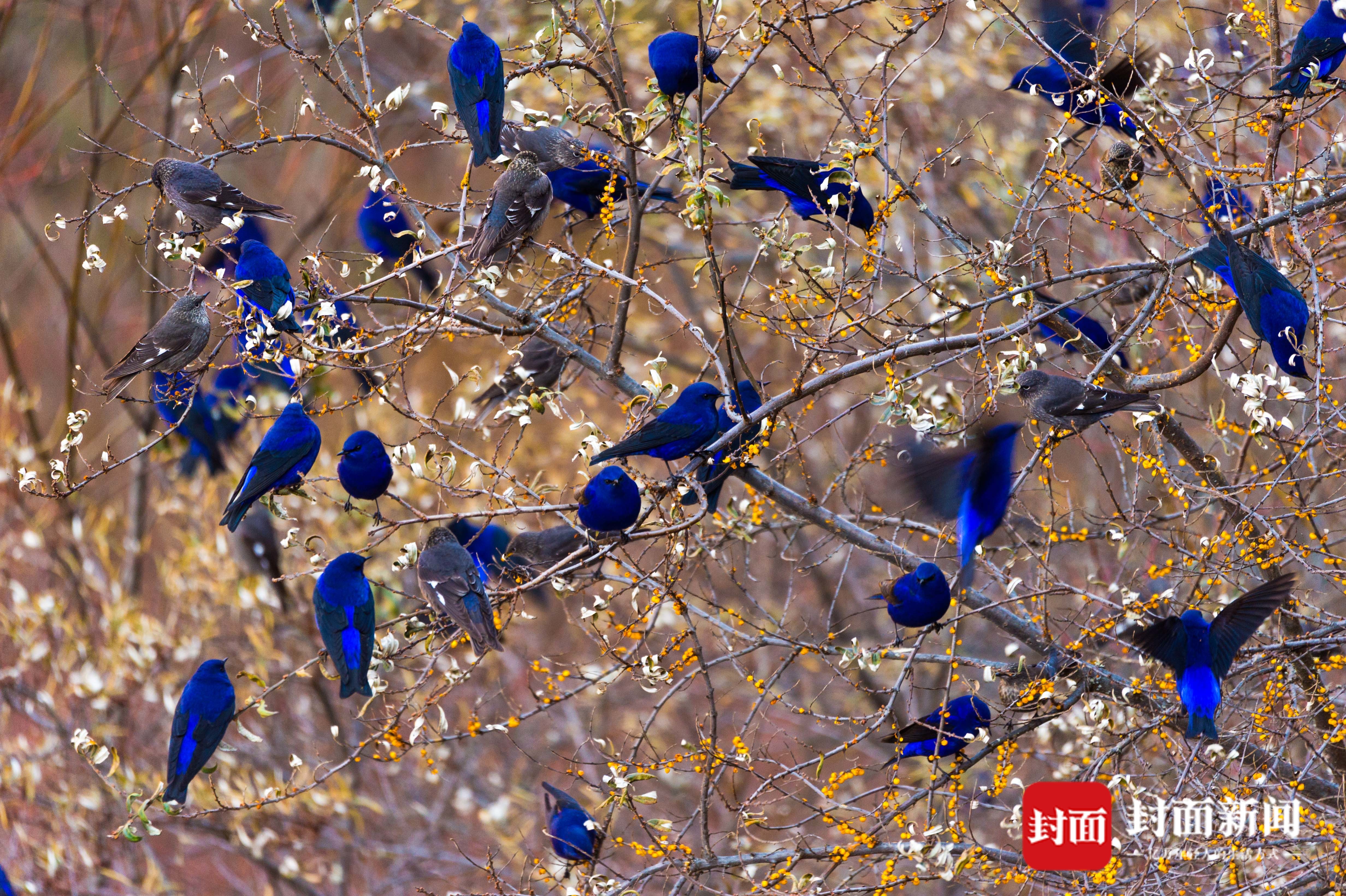 雅安夹金山下,千只蓝大翅鸲浩浩荡荡在空中飞翔。它们或相拥在电线上取暖,或群起采食沙棘果实,十分壮观。
