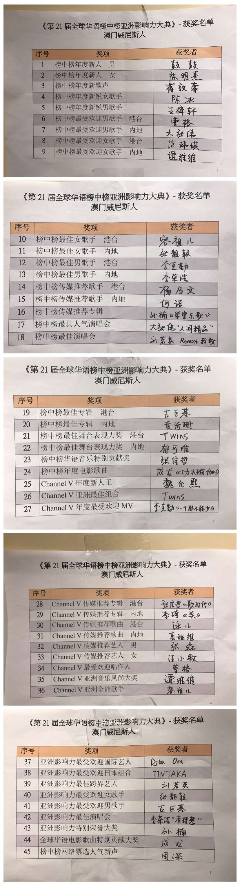 4月20日晚,第二十一届全球华语榜中榜暨亚洲影响力大典于澳门威尼斯人金光综艺馆落下帷幕。大典上共颁发出45个奖项,包括成龙、古巨基、容祖儿、李克勤、刘若英、大张伟、张信哲、张靓颖、twins、赤西仁、山田孝之等在内的众多重量级艺人出席,现场巨星云集、星光熠熠。