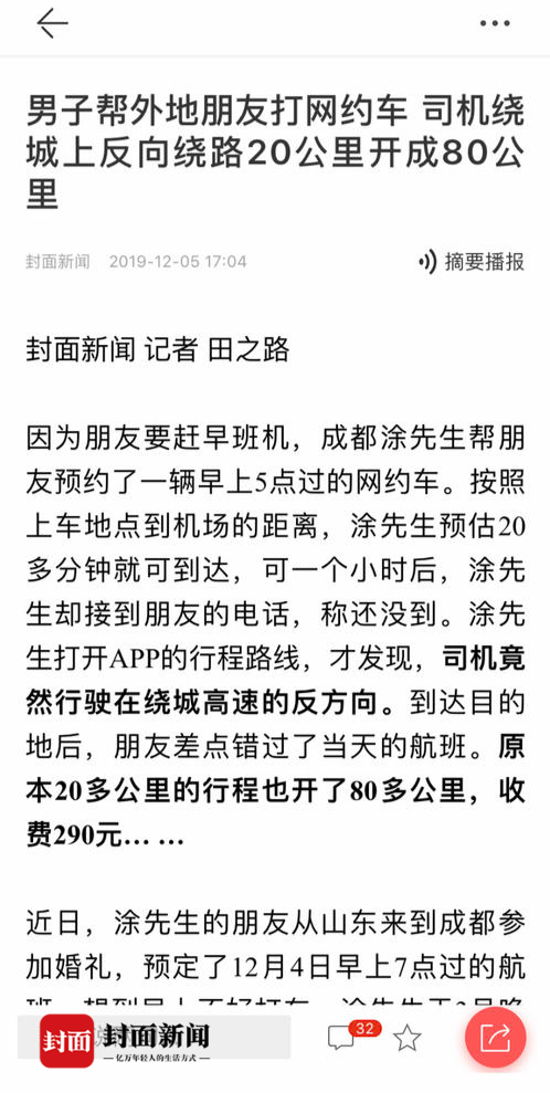 日前,封面新闻曾重点报道,市民涂先生称,他通过网约车平台预约,将朋友从成都火车东站送至双流机场,驾驶员以“三环封路”为由,把20公里的行程绕道多跑成80公里,导致朋友差点错失航班。>>男子帮外地朋友打网约车 司机反向绕路20公里开成80公里>>