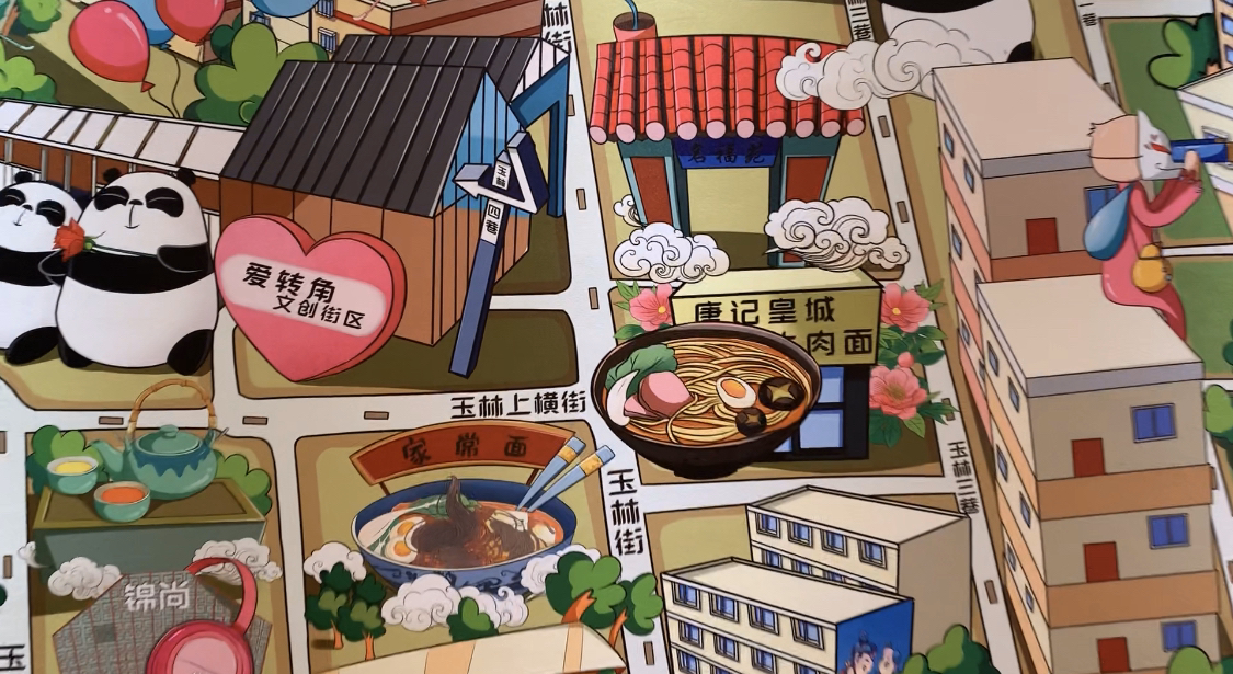 “现在,很多年轻人特意从外地飞来成都打卡,但拍完之后,他们非常希望能真正融入玉林的本土生活。”玉林街道相关负责人表示,针对大量青年游客的需求,“爱转角”专门通过场景设置、软装设计打造了一间网红书屋。社区同步推出手绘“玉林美食打卡地图”,在“爱转角”文创街区周围1公里内,串联上玉林串串香、锅盔女王、手撕烤兔、天添饭店等三十余地道成都美食。