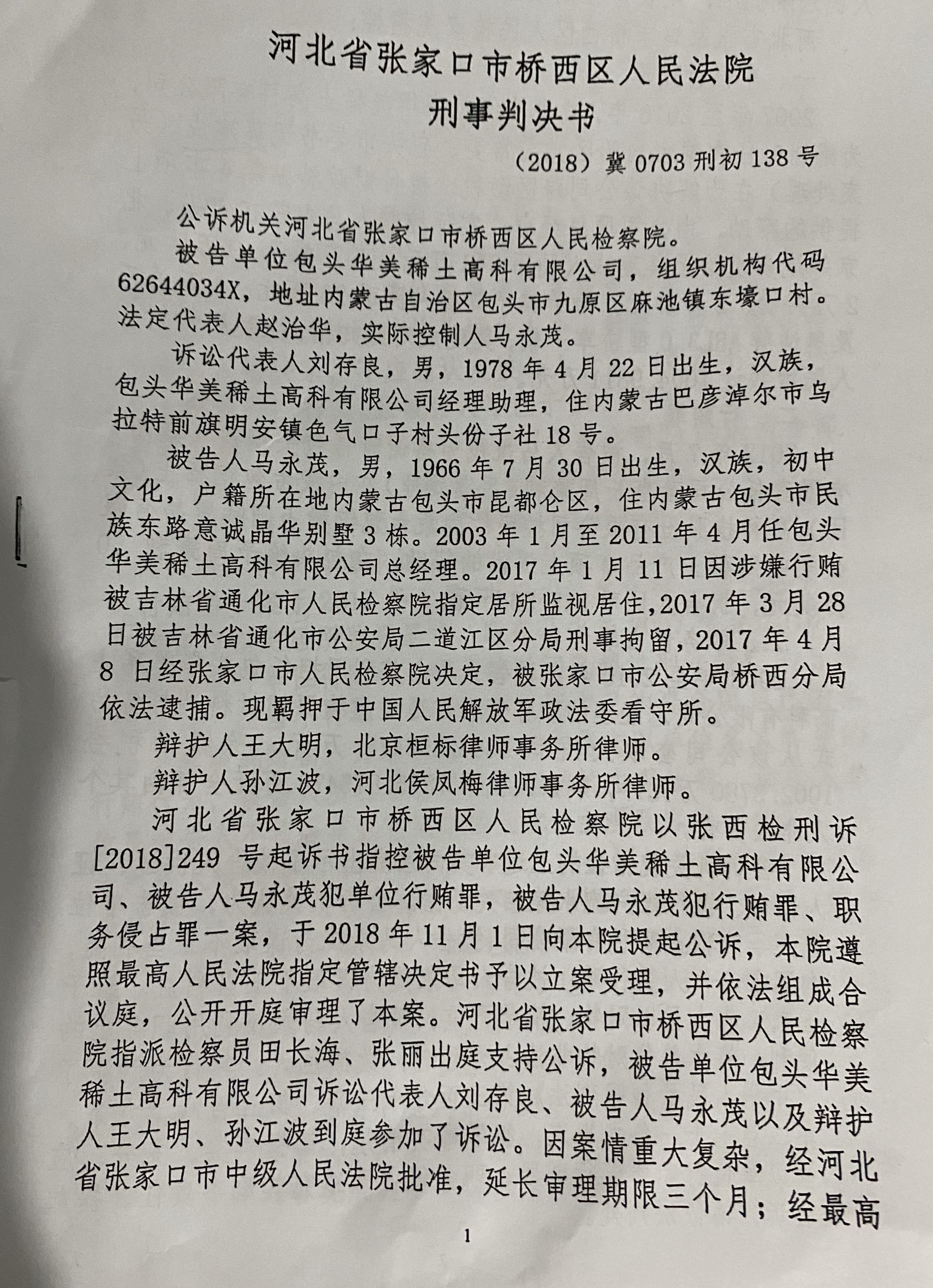 2019年6月28日,张家口市桥西区法院一审以马永茂犯单位行贿罪、行贿罪、职务侵占罪,三罪并罚,决定执行有期徒刑十年六个月,并处罚金100万元。