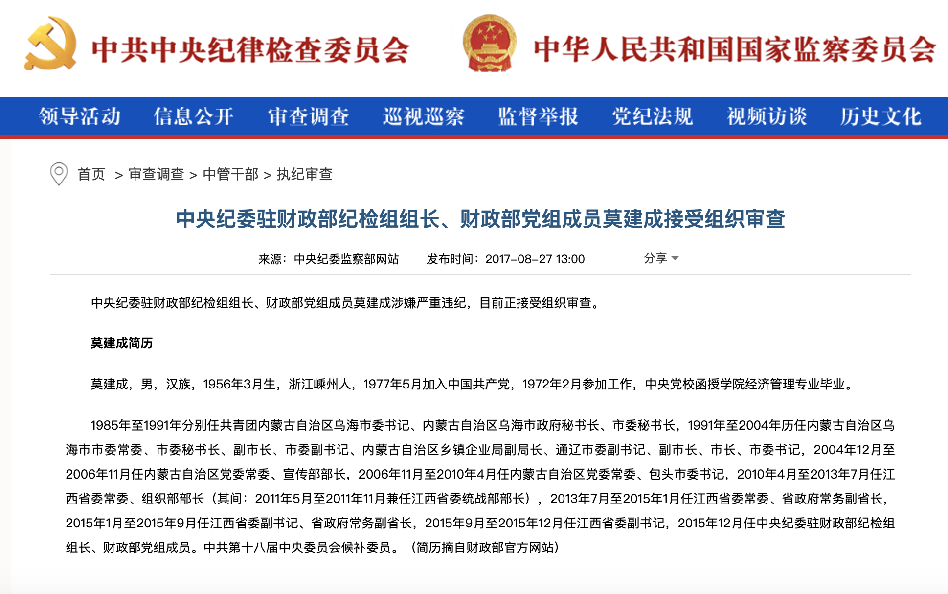 2017年8月27日,莫建成接受审查。图据中纪委官网