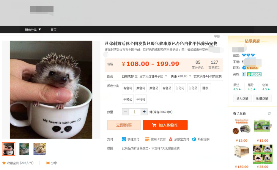 5月6日,封面新闻—华西都市报记者打开吴先生此前使用的购物网站发现,这是一家销售活体刺猬、发货地点在四川成都青羊区某街道的商家。网页的宣传语上明确表示,活体刺猬199.99元一只。记者翻看销售记录,有百余销售数量以及数十条评论,也证实这是一家销售活体刺猬的网店。