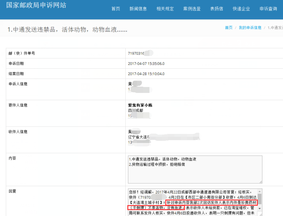 从时间点上梳理发现,4月2日吴先生购买了这两只刺猬。4月6日,中通快递员把包裹送达吴先生手中,当即,吴先生提出了包裹异常,当天,该快递员已经当作异常包裹上报中通总部。也就是说,至此,中通已经知道快递的包裹就是活体动物。而国家邮政局的回复是在4月28日,为何快递公司仍然调查结果是,发件人说的说珍贵药材(干刺猬)呢?