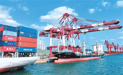 十月二十九日,直达韩国仁川港的“泛奥升奥普轮”(右)在青岛港前湾港区装卸集装箱(无人机照片)。新华社记者 李紫恒摄