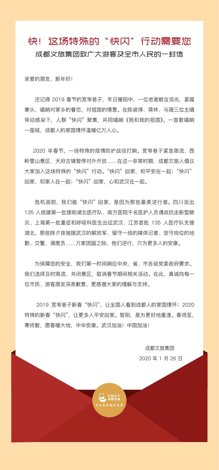 封面新闻记者从成都文旅集团相关负责人了解到,为响应中央、省、市各级党委政府要求。成都文旅集团选择及时限流、关闭景区,取消春节期间相关活动。