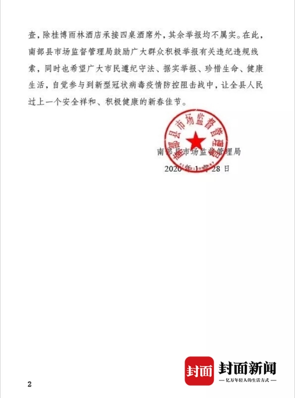 “为了大家,也是为了你们自己,今天的酒席必须解散……”2020年1月28日11时许,四川省南充市南部县桂博语林酒店二楼的四桌酒席旁,客人才到几个人,南部县纪委监委、南部县公安局、南部县市场监督管理局的干部即刻赶到。酒席解散了,而顶风承接宴席的桂博语林酒店受到南部县市场监督管理局的严处。