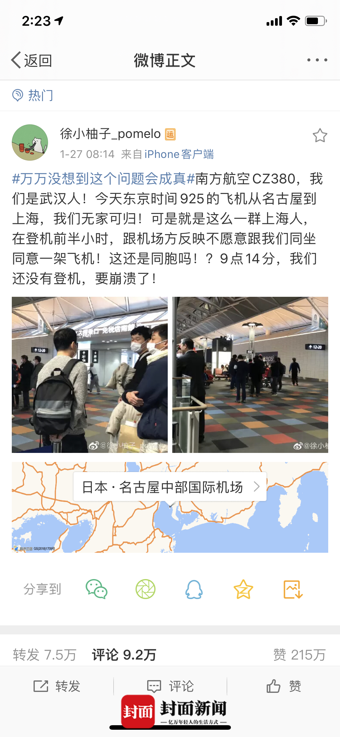 1月27日,一名武汉网友在微博上发文称,由于同机上海乘客拒绝与自己等几名武汉乘客乘坐同机回国,导致包括自己在内的武汉乘客无法乘坐从日本名古屋飞回上海。微博发出后,引发热议。
