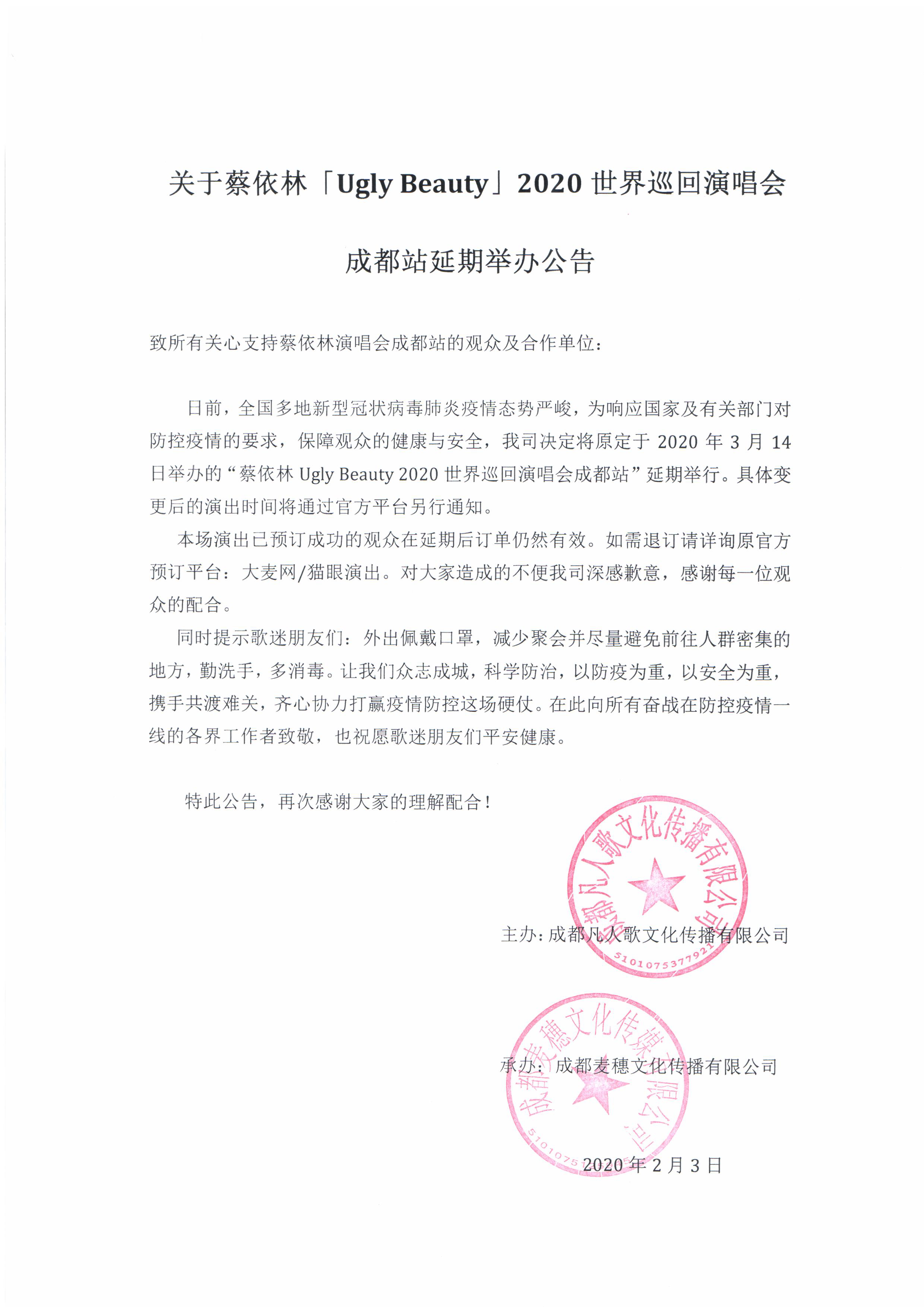 记者刚刚从蔡依林“UGLY BEAUTY”2020世界巡回演唱会成都站主办方了解到,考虑到多地新型冠状病毒感染的肺炎疫情态势严峻,原定于3月14日在成都举办的蔡依林演唱会将延期举行。具体变更后的演出通知将通过平台官方另行通知。