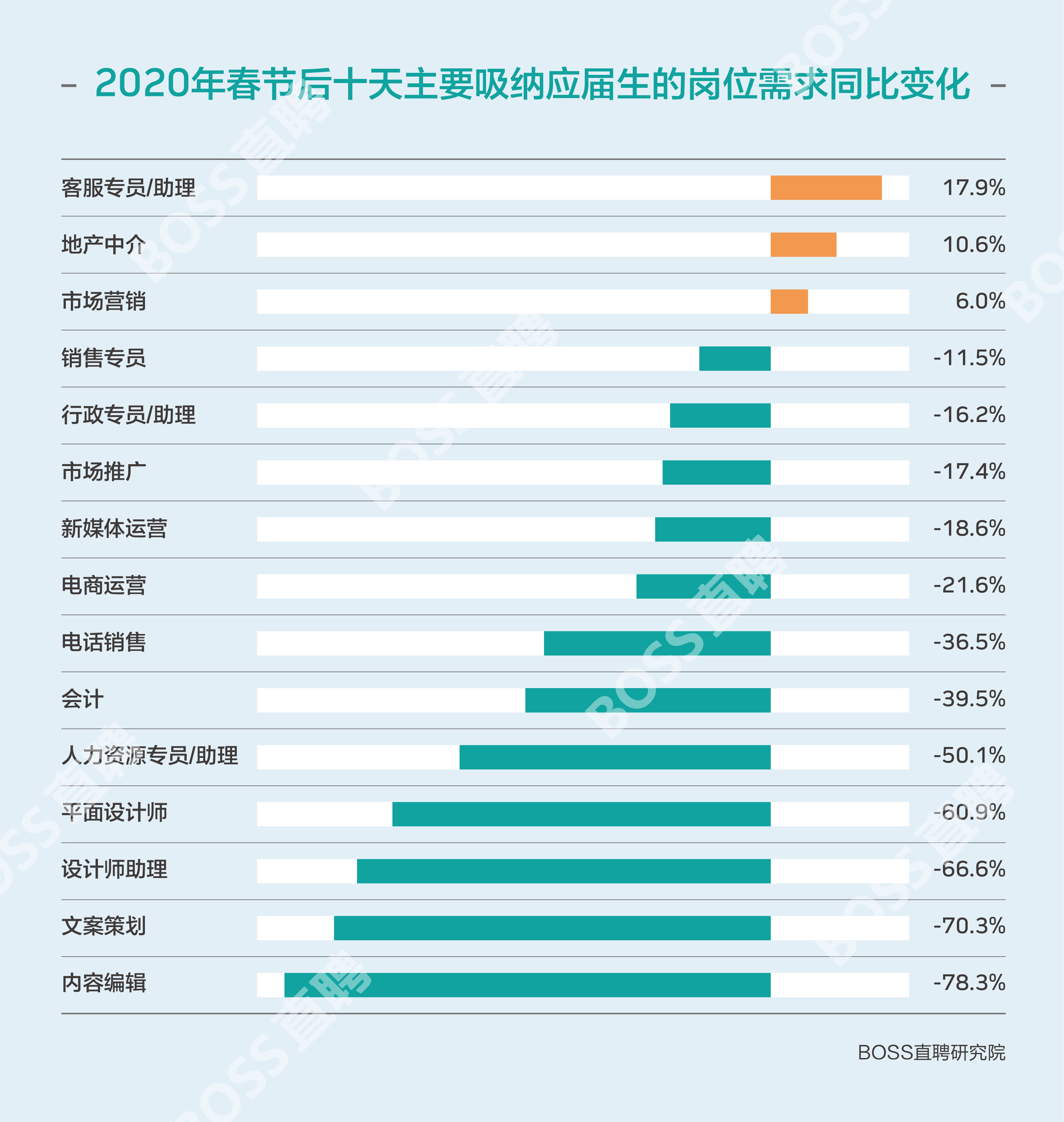 从岗位来看,近几年吸纳应届生最多的15个岗位,整体需求也明显减少。其中,内容编辑、文案策划岗位受线下文娱产业遭到重击的影响,新增需求下降超过七成。虽然,客服专员、地产中介和市场营销类岗位,应届生需求仍保持上涨趋势。但是,以往强专业型岗位的应届生招聘需求下滑极为严重,数据挖掘、风控、算法工程师、化学分析等岗位的应届生需求降幅普遍超过八成。