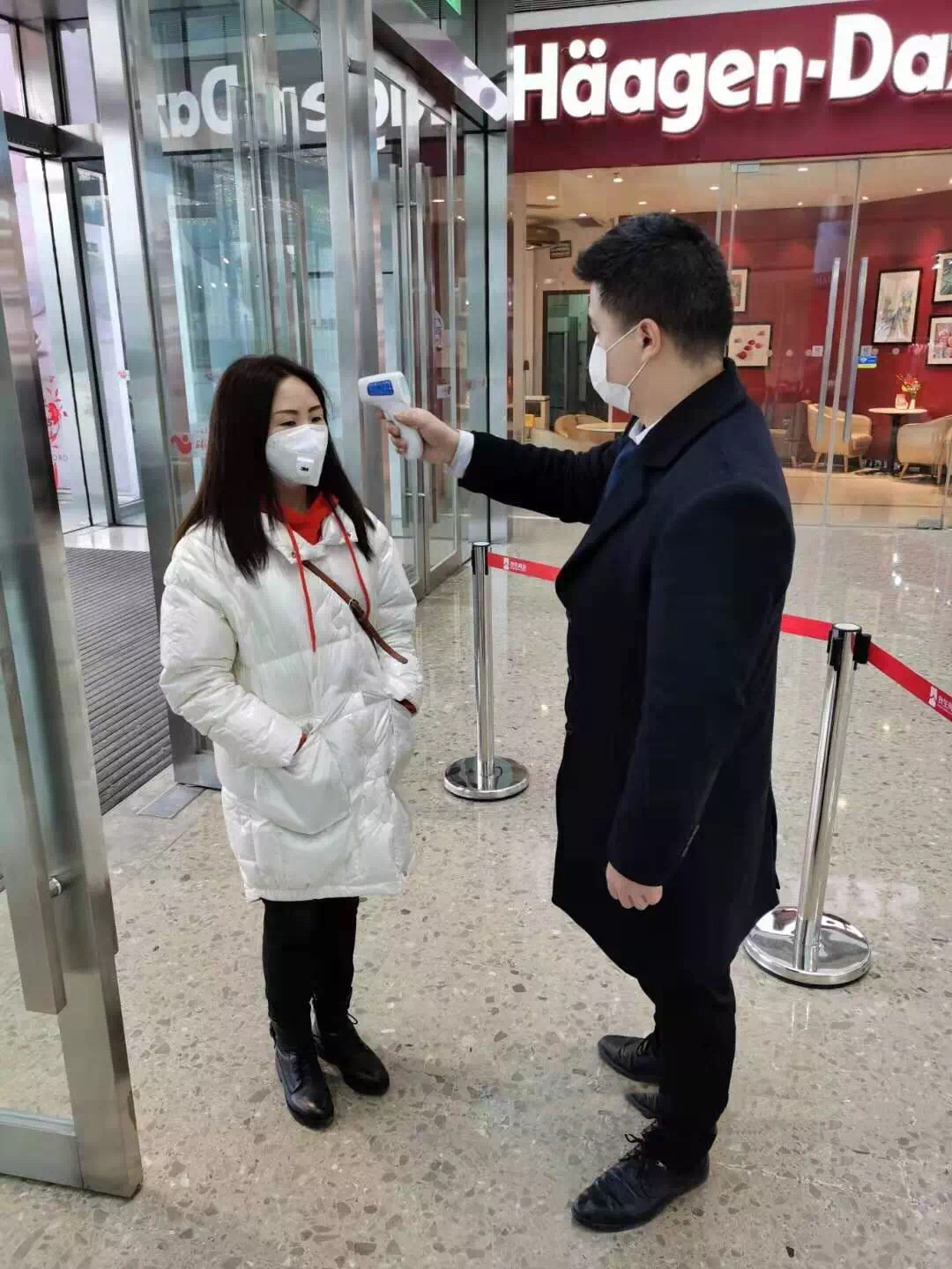 合生珠江商业广场工作人员对每一位顾客进行温度检测