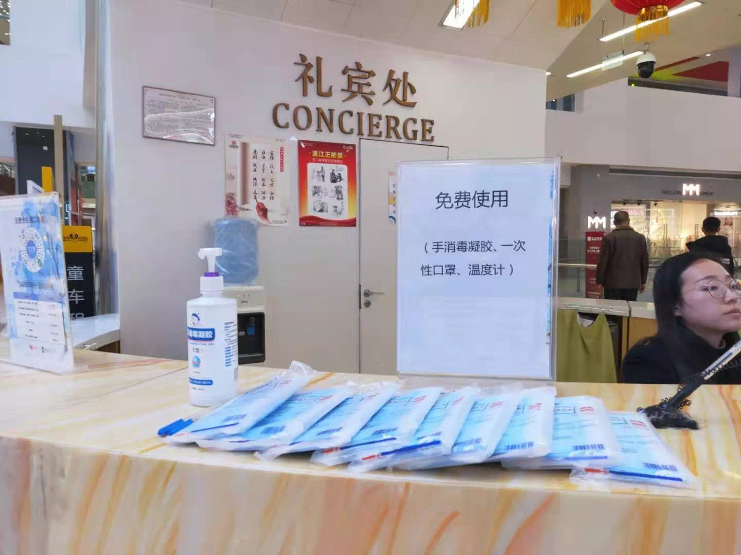 免费使用的消毒液、一次性口罩、温度计