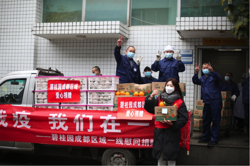 2月15日上午,碧桂园成都区域将刚刚从蒲江县采购的1500斤春见柑橘送到了四川省人民医院,致敬一线医护人员。