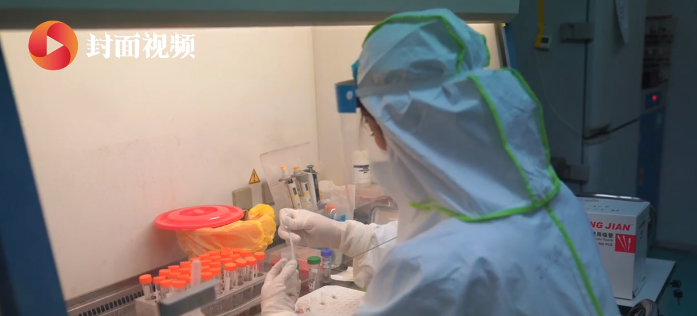 每天早上8:00,按照生物安全三级防护,检验人员穿戴好个人防护装备——首先是消毒,戴上双层手套,穿上一次性连体防护服;然后依次戴上N95医用口罩、护目镜、帽子,穿上鞋套;最后拉上防护服的拉链,再检查防护服是否穿好。在所有防护准备完成后,检验人员才可以进入实验室。