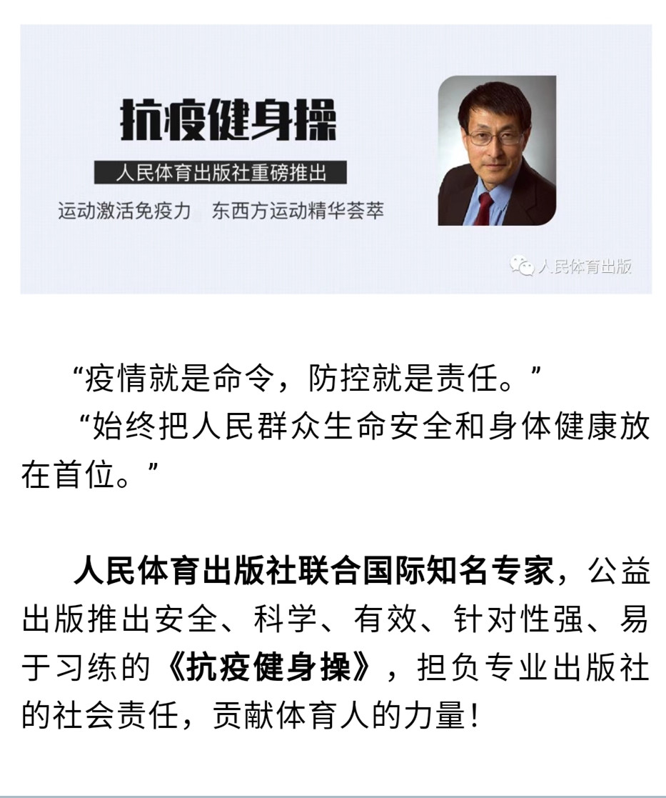 新华社北京2月17日电 17日,人民体育出版社与著名运动人体科学专家朱为模博士团队合力奉献的《抗疫健身操》电子书正式出版。本书是继2月15日出版的《居家健身防疫——世界冠军带你强身健体》之后,人民体育出版社公益出版的第二本防疫系列图书。