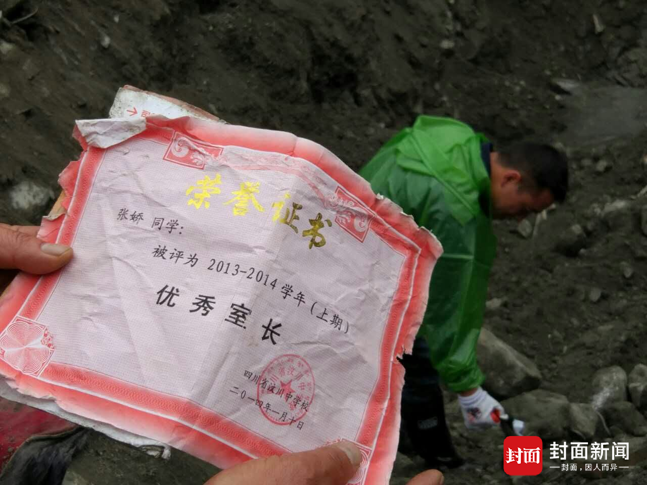 电话中,李智告诉我,此事为真。为了证明所言非虚,李智给我讲了他们相遇的细节:昨天下午5点零5分,乐山市矿山救援队在本地人向导下,在有过房子的地方用生命探测仪搜寻生命。本地人85后张科宇出现了在他们面前,在探测的第8个点位时,把他们带到了挖出张娇作业本的地方,并展示了张娇获得过汶川中学的优秀室长的荣誉证书,指着地上说,“这里是我亲人的家,请你们帮忙探测一下,看看里面是否还有生命迹象?”张科宇望着他们,满脸期待。李智所在的探测队员沿着他指引的方向,探测了七八分钟。这期间,他注意到,张科宇的眼神紧紧盯着测量仪器。结果,很遗憾,没有出现任何有生命的迹象。安慰了一阵子,李智们带着设备继续在现场搜寻生命。25日早上,当他再次在救援现场遇见张科宇时,对方告诉他张娇头天晚上从成都回来了,回来寻找父母。
