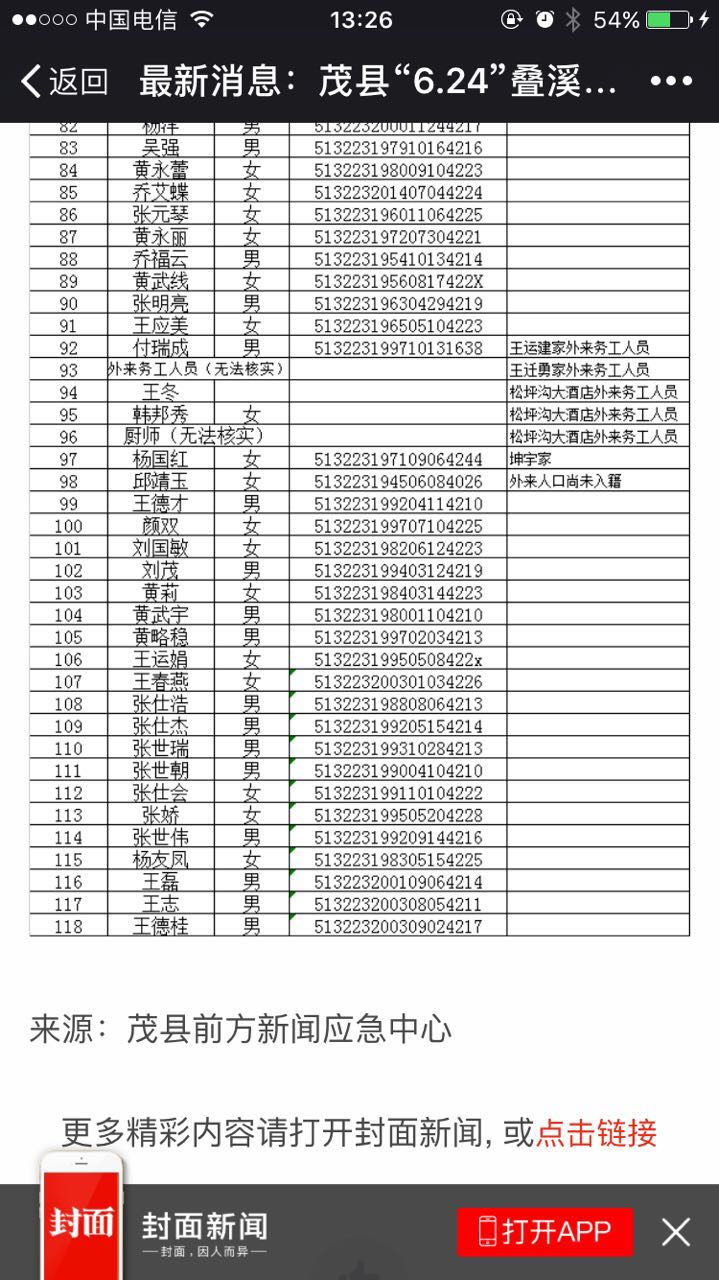 茂县山体垮塌失联者名单由118人减少为116人,张娇、张世伟两人分别排在名单上的113、114。希望有更多失联人员出来“销号”!