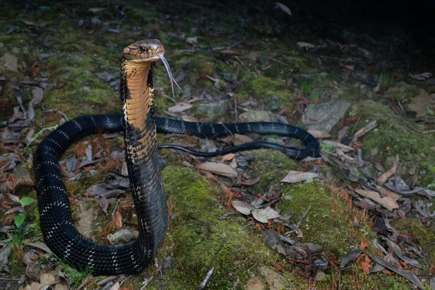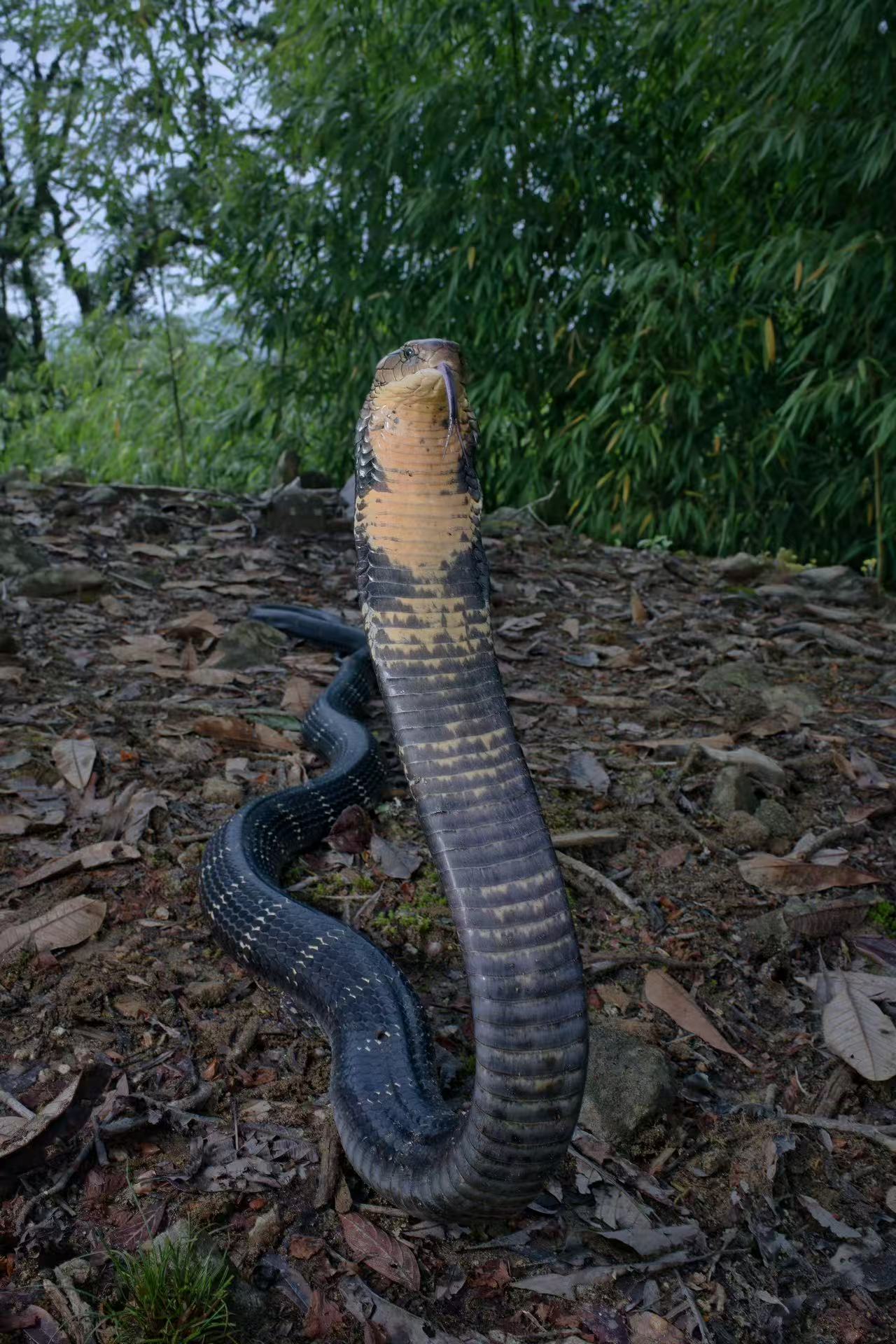 因此,如果是眼镜王蛇的繁殖季节在林中发现树叶堆积成的小丘,一定要格外小心是否闯入了眼镜王蛇的“领地”。