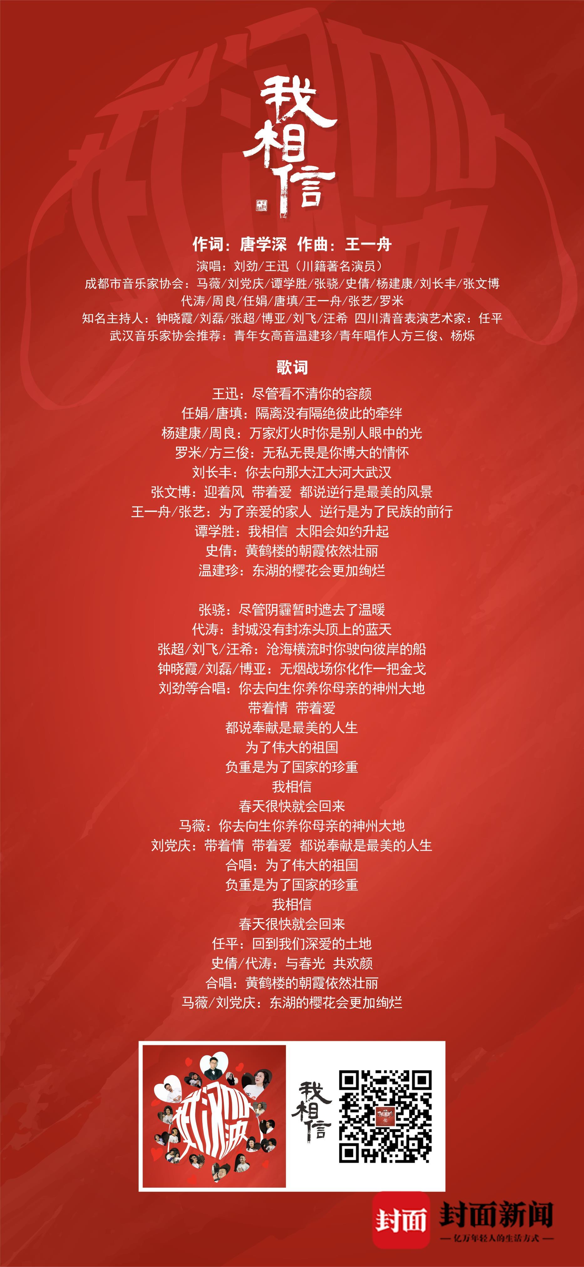 据悉,《我相信》是由成都市文联机关干部唐学深于1月28日在值班时写成。唐学深表示,在这场看不见硝烟的战斗中,我们国家有着强大的社会动员能力和不可替代的制度优势,群防群治、科学治疫的同时,信心也特别重要,因此有感而发写下了《我相信》。
