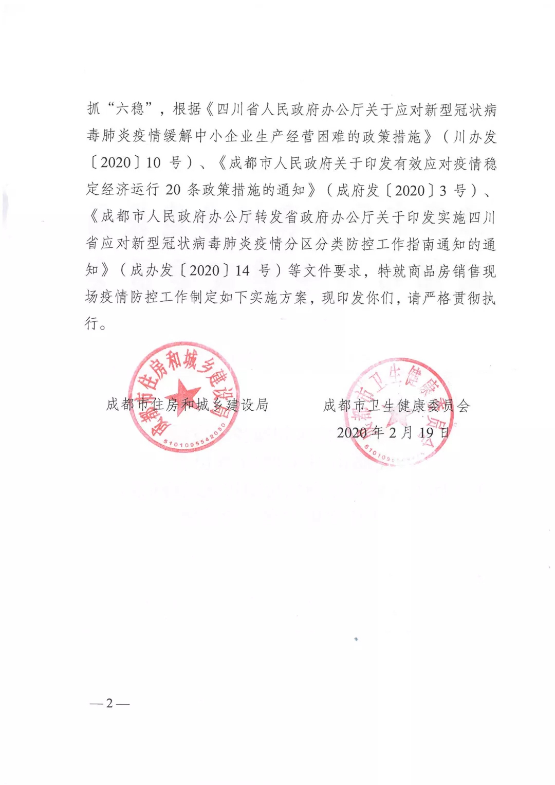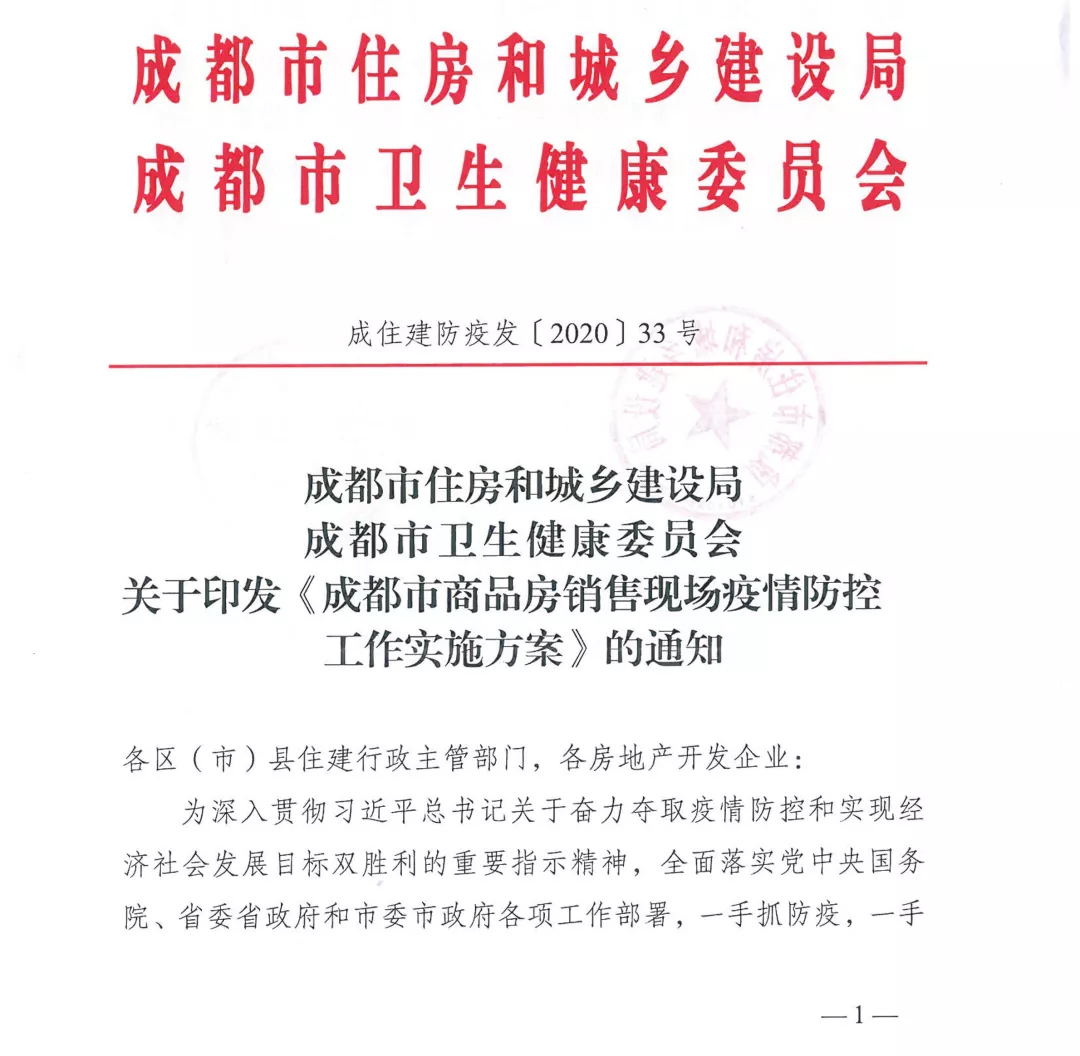 在2月19日,成都发布了一份《成都市商品房销售现场疫情防控工作实施方案》的通知(成住建防疫发〔2020〕33号 )。