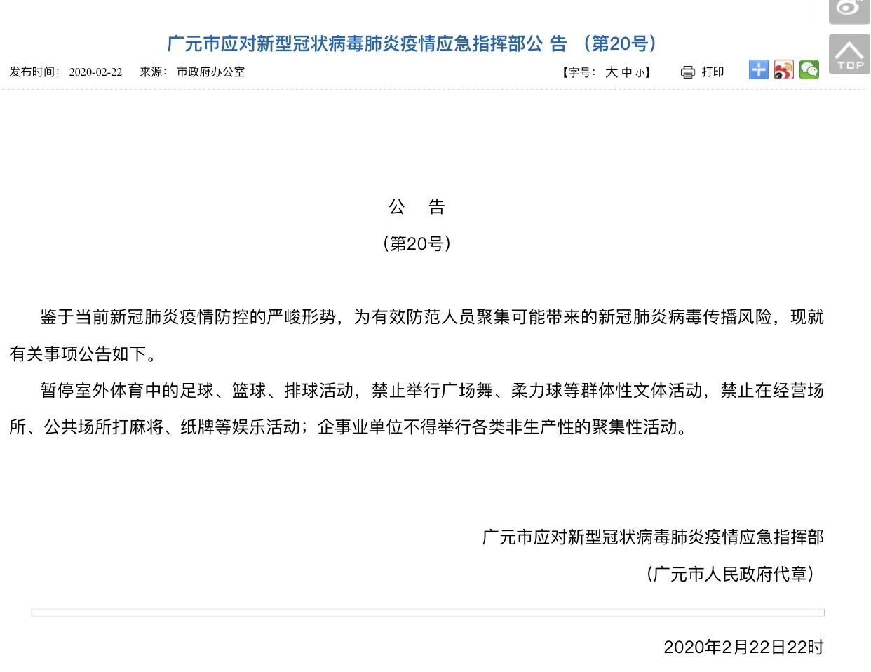 2月22日22时,四川广元发布应对新型冠状病毒肺炎疫情应急指挥部第20号公告 ,暂停室外体育中的足球、篮球、排球活动,禁止举行广场舞、柔力球等群体性文体活动,禁止在经营场所、公共场所打麻将、纸牌等娱乐活动;企事业单位不得举行各类非生产性的聚集性活动。