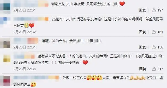 “ 周杰伦、方文山、张学友,他们对推新歌很保密,我们环球唱片2月23日晚发布《等风雨经过》时,也只是在几个小时前才知道,这是周杰伦周董联合方文山为张学友共同打造的一首抗击新冠肺炎疫情的歌曲。”