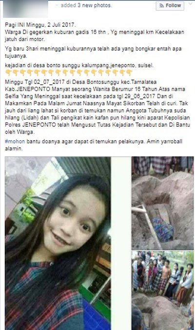 脸书网友尤尼(Yuni)上传了少女生前照片和被挖坟的现场照,并表示少女的舌头和绑遗体的布绳不见了。