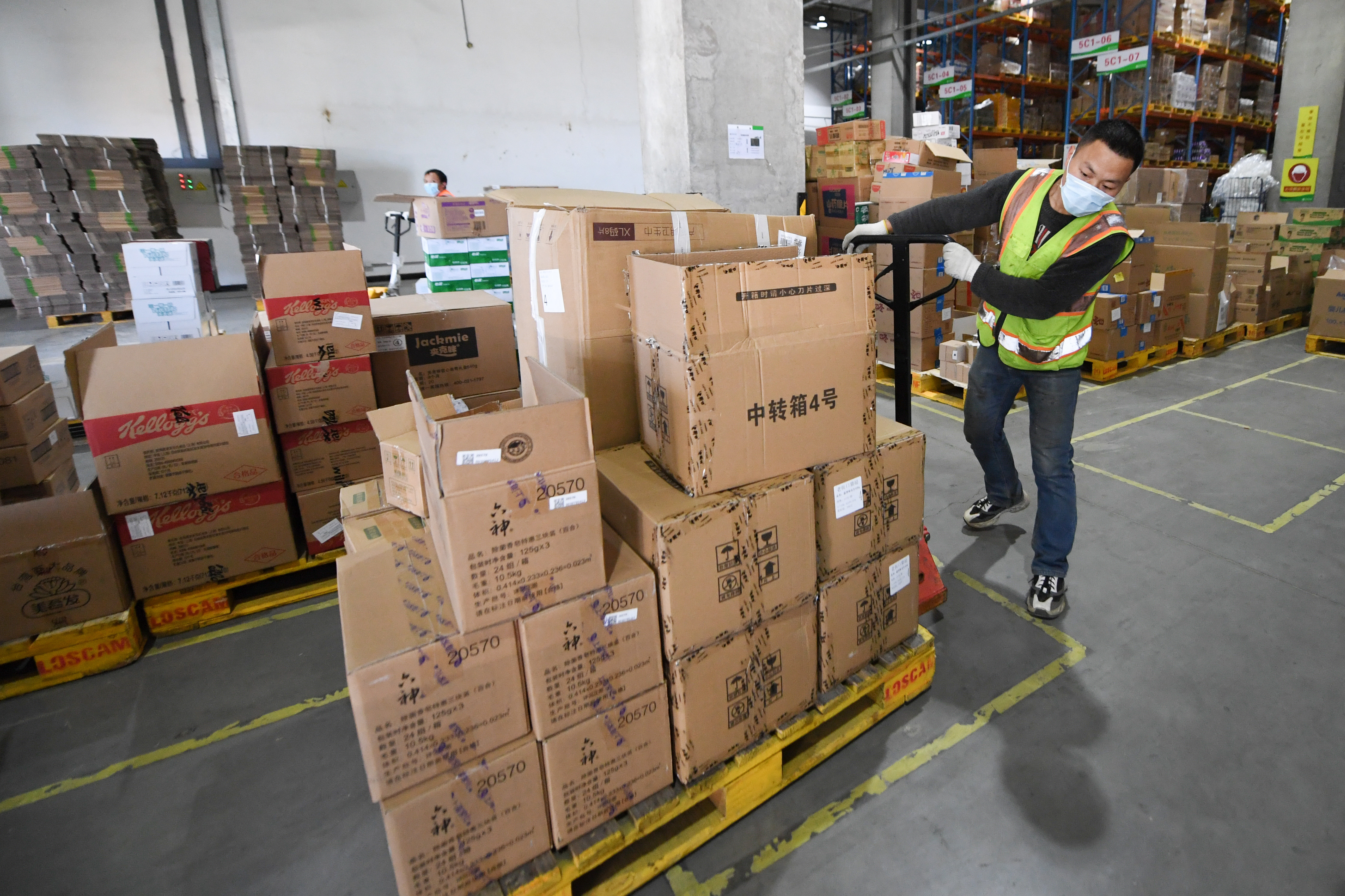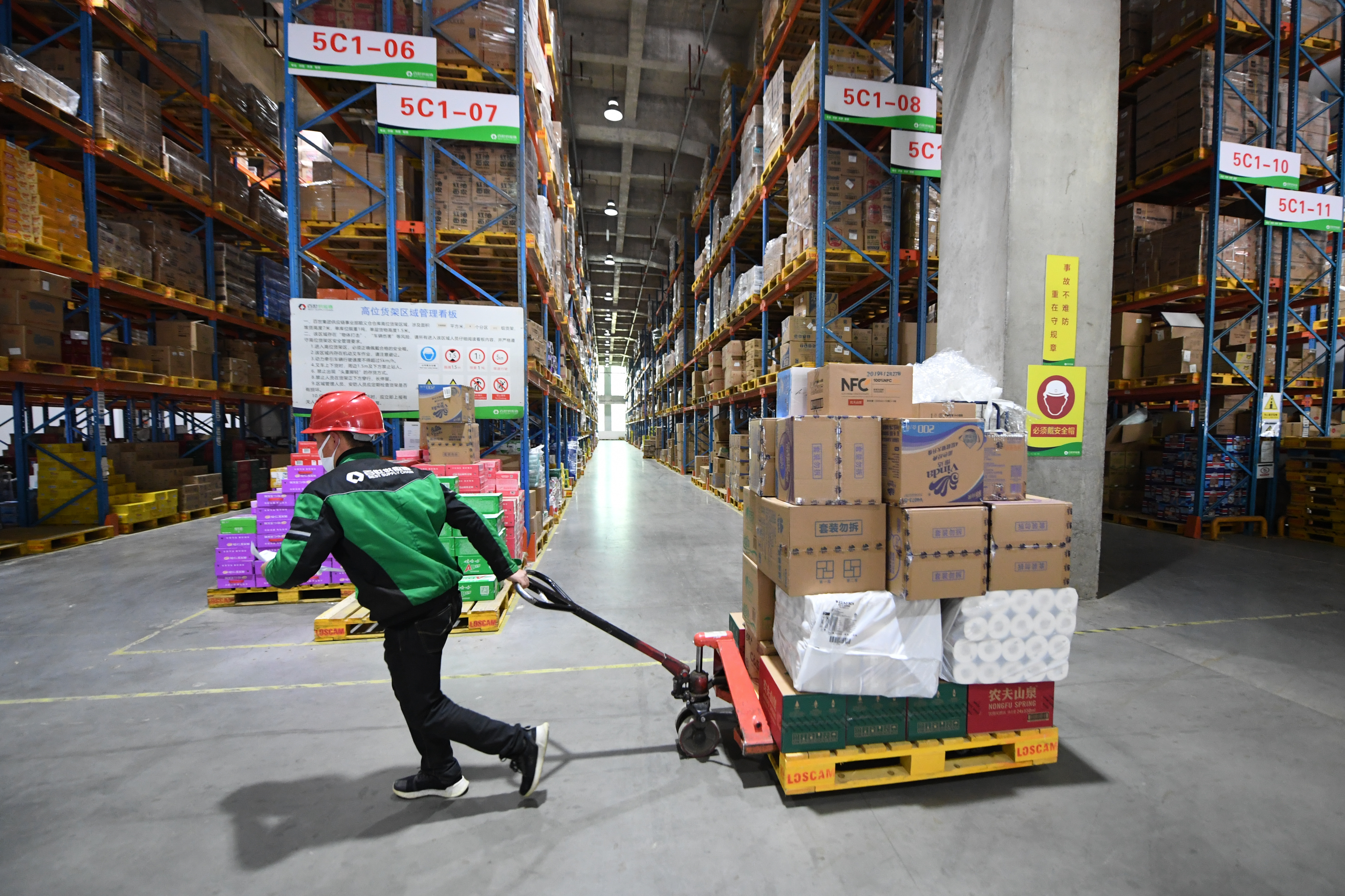 ↑3月12日,在北京市顺义区菜鸟物流仓库,一名工作人员在搬运商品。