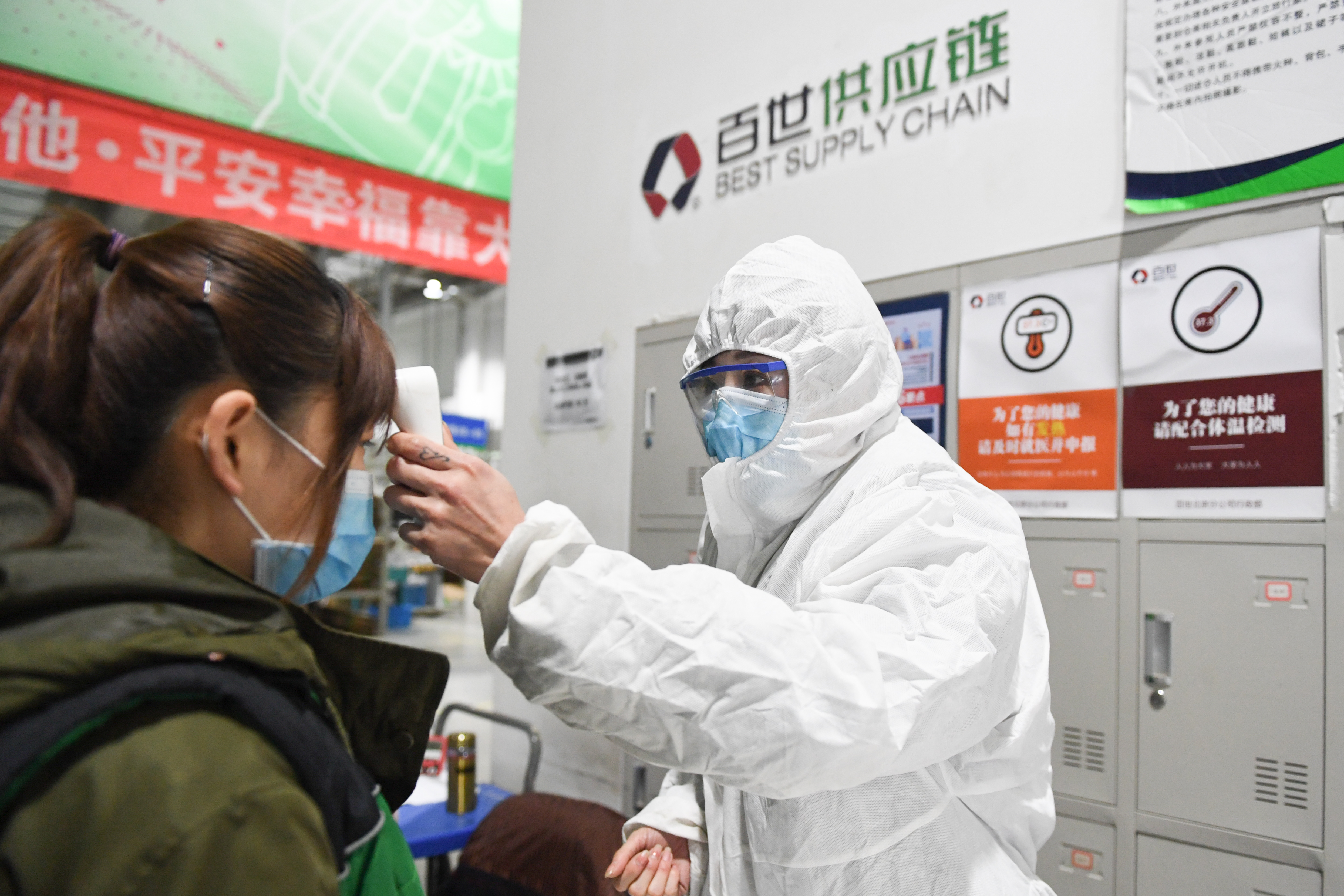 ↑3月12日,在北京市顺义区菜鸟物流仓库,一名工作人员(右)在为进入仓库的员工测量体温。