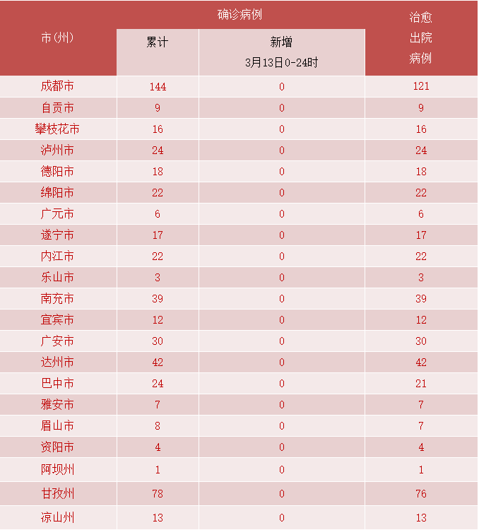 据健康四川官微消息:3月13日0-24时,四川省新型冠状病毒肺炎无新增确诊病例,新增治愈出院病例10例,无新增疑似病例,无新增死亡病例。