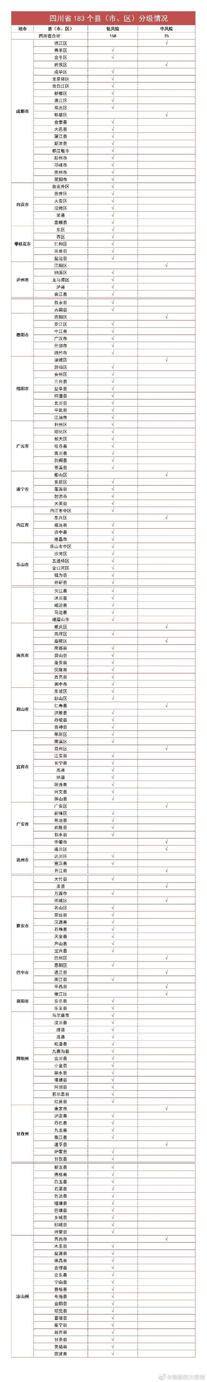 全省现有无现症病例区(低风险县<市、区>)158个、散发病例区(中风险县<市、区>)25个,无社区暴发和局部流行区(高风险县<市、区>)。(过去24小时新增金堂县、三台县、仪陇县、阆中市、甘洛县为低风险县<市、区>)。
