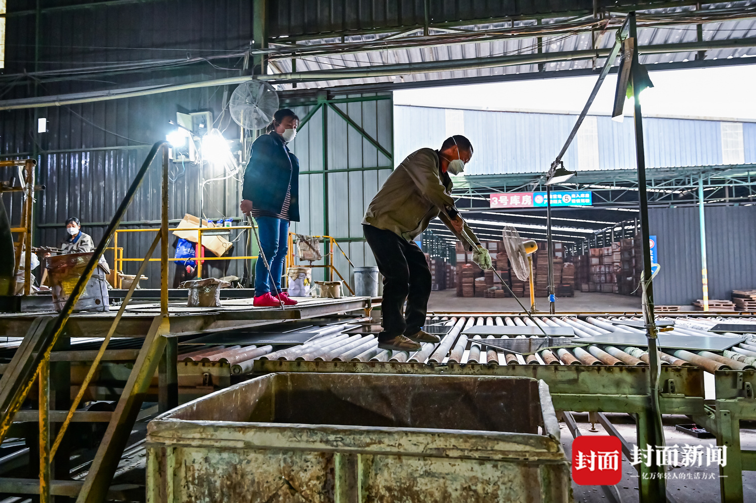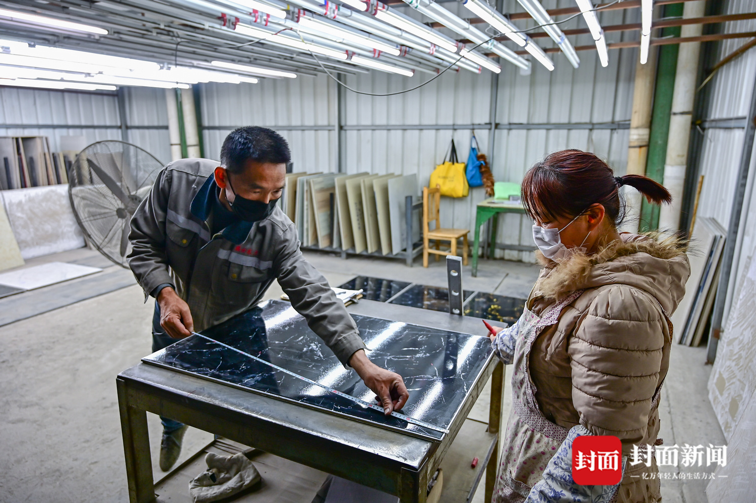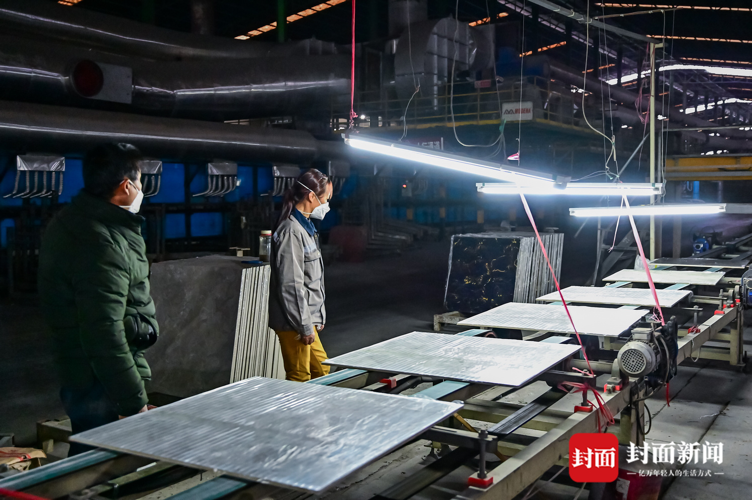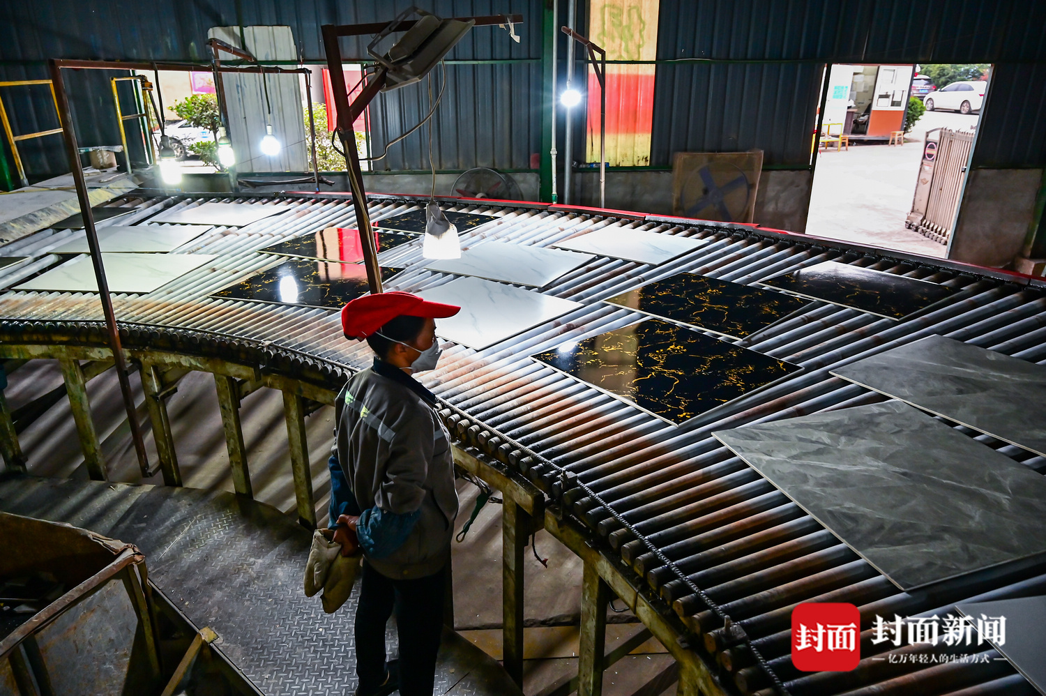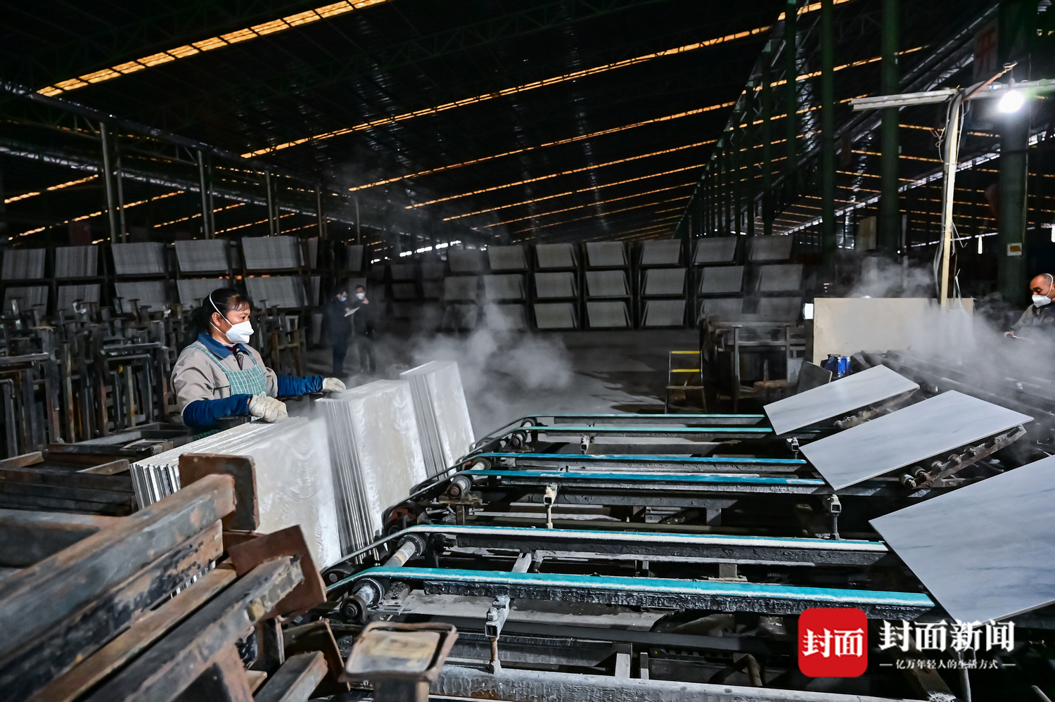 生产车间内,机器的轰鸣声中,一片片800mm×800mm的地砖源源不断产出。一条流水线上,同时出来的有3种花纹,分线工冯淑容站在流水线的上方,不时调整线路将它们分往不同的端口打包。“已经复工一段时间了,之前还担心停工太久,没地方挣工资。”冯淑容是当地新场镇人,儿子、女儿也在附近陶瓷厂上班,工资收入是家庭主要收入来源。