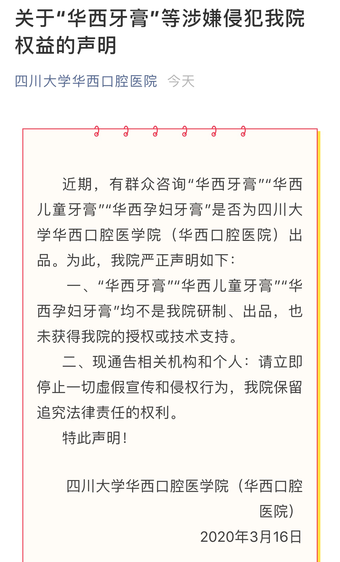 近日,有市民咨询“华西牙膏”“华西儿童牙膏”“华西孕妇牙膏”是否为四川大学华西口腔医学院(华西口腔医院)出品的问题,引起了热议。3月16日,四川大学华西口腔医学院相关负责人表示,上述牙膏均并不是由该院研制、出品,也未获得该院的授权或技术支持。