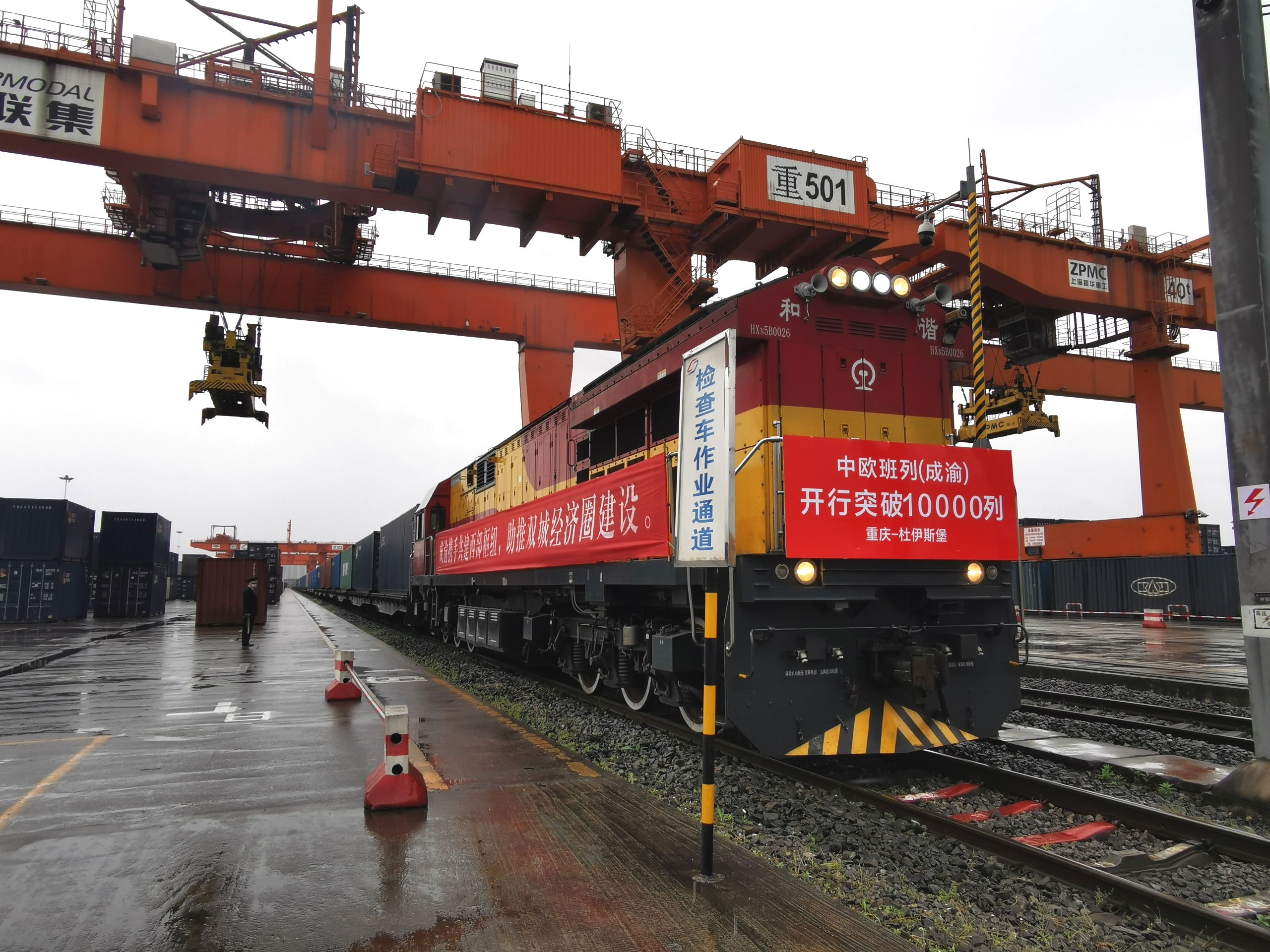 与过去6年所不同的是,这列中欧班列不再使用“成都”“重庆”标识,而是共同使用“成渝”标识。更明显的变化是,本次列车的车头装饰着“中欧班列(成渝)开行突破10000列”的标牌,火车机身上亦挂着“成渝两港携手共建西部枢纽,助推双城经济圈建设”横幅。