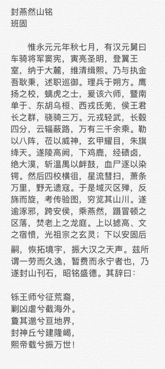 《封燕然山铭》是东汉历史学家、辞赋家班固所作,不单是是历史记载最早的刻石纪功碑之一,由于其语言优美,文体新颖,也是重要的文学典故之一,对后世文学产生深远影响。唐代诗圣李白至少4次在诗中引用了班固勒燕然山的典故。