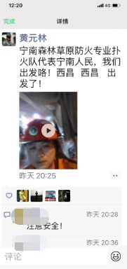 晚上8点25分,在前往火场的车上,黄元林发了一条15秒的自拍视频到朋友圈,内容是他和车上的队员们,说:宁南森林草原防火专业扑火队代表宁南人民,我们出发咯!西昌,西昌,出发了!