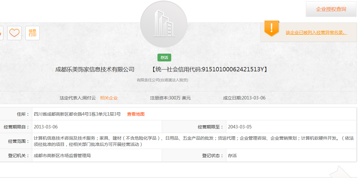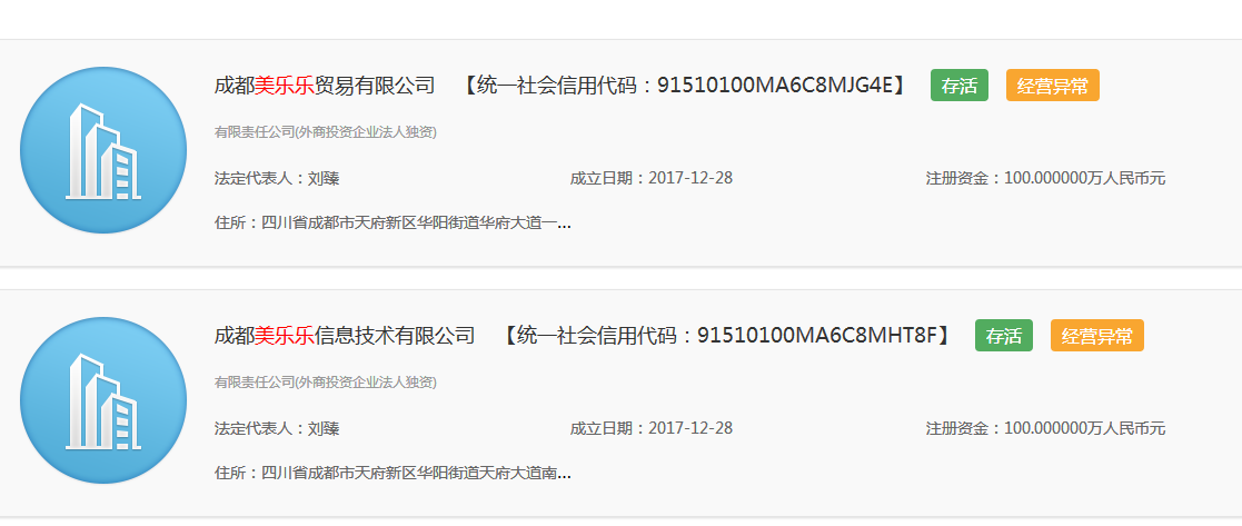 随后,封面新闻记者在成都工商局官网上查询该企业信息,发现成都乐美饰家信息技术有限公司已被列入经营异常名录,其子公司成都美乐乐贸易有限公司、成都美乐乐信息技术有限公司均显示经营异常,而其官网也无法打开。记者随后致电美乐乐成都分公司负责人,电话一直处于无人接听状态。