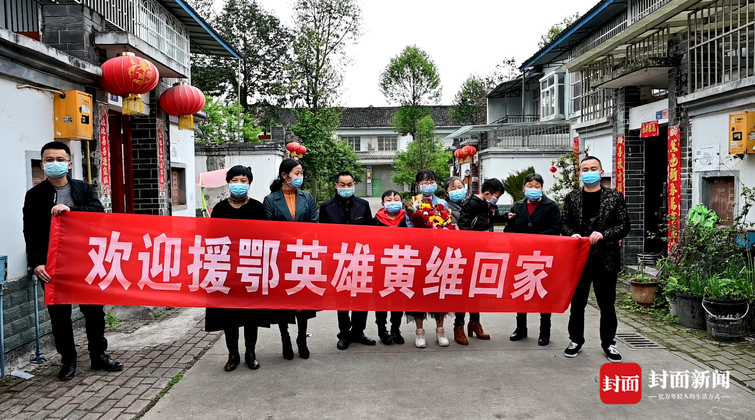 4月1日下午,成都市大邑县沙渠街道蔡场社区。“我回来了。”黄维从车上下来,朝家门口走去,妻子抱着鲜花,旁边是两个儿子,满眼含笑看着他。妻儿身后,还跟着其他人,大家拉出一面横幅,“欢迎援鄂英雄黄维回家”。